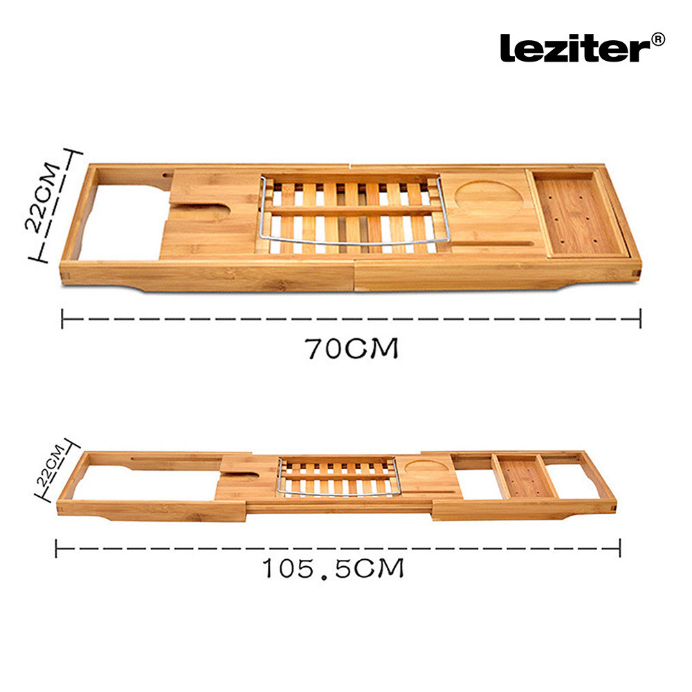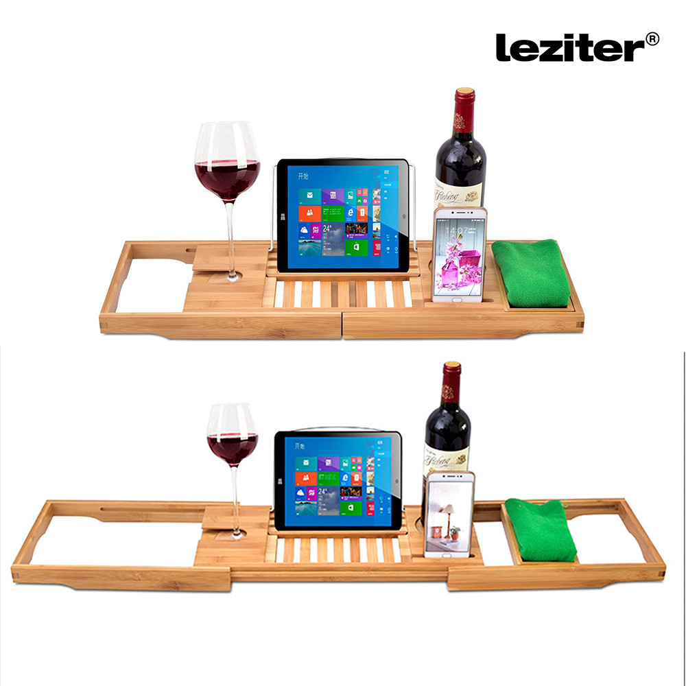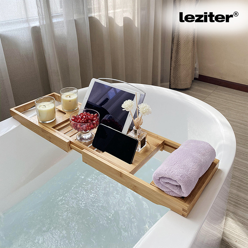 A Leziter állítható bambusz fürdőkádtálcája segít megteremteni a tökéletes pihenést. A tablet- és könyvtartó állvány stabil tartást biztosít, a borospohártartó biztonságos helyet kínál, a külön rekeszekben pedig telefon és egyéb apróságok is elférnek.