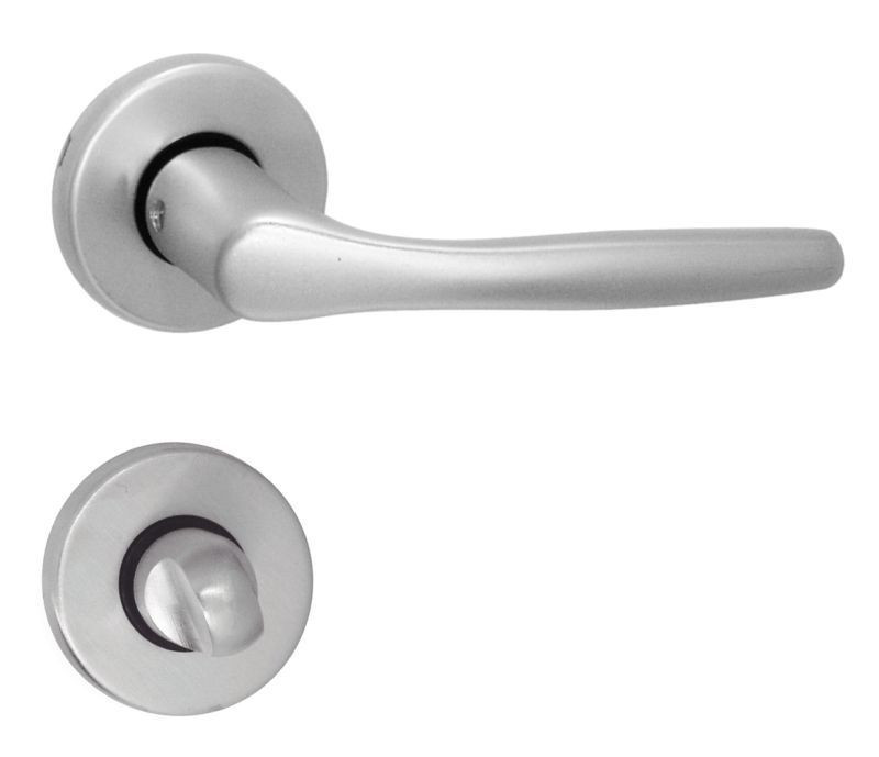 Az Alu F1 rozettás WC záras kilincs kilincs ezüst színre eloxált, letisztult formavilága a modern otthonok és helyiségek tökéletes kiegészítője. Könnyen zárható, beltéri WC ajtó kilincs.
