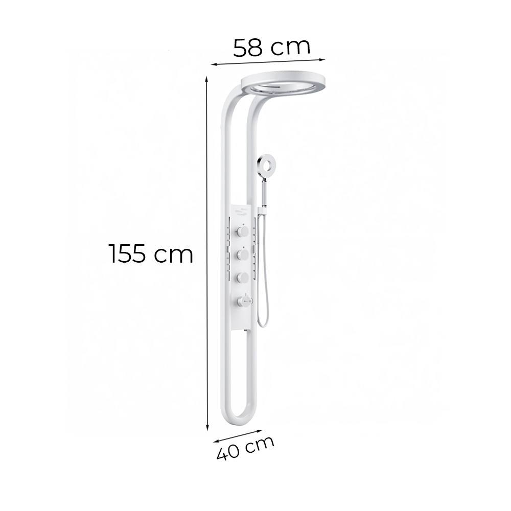 A zuhanypanel rozsdamentes acélból készült, amely garantálja a hosszú élettartamot és a prémium megjelenést. A fehér szín modern eleganciát sugároz, amely bármely fürdőszobai környezethez illeszkedik.