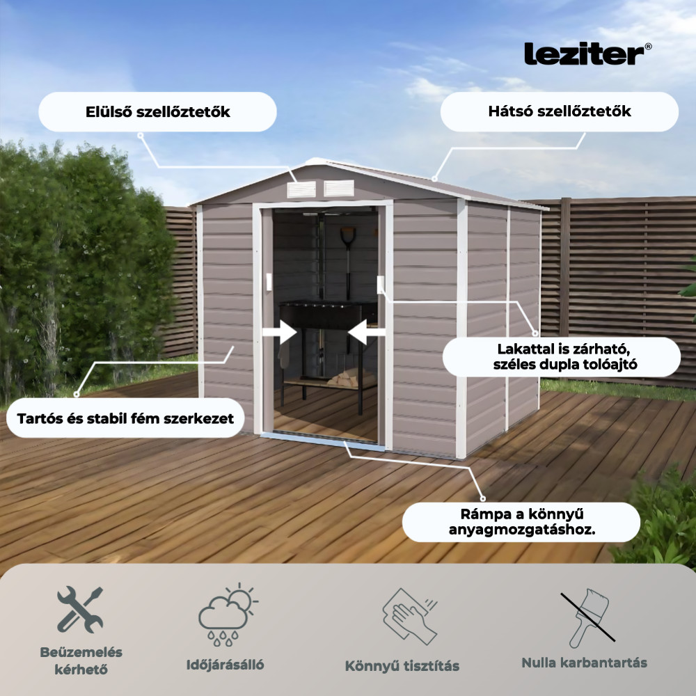 • Robusztus kialakítás: Az erős szerkezet és a kiváló minőségű, tartós anyagok hosszú élettartamot biztosítanak, ellenállva az időjárás viszontagságainak. Az Arizona szerszámtároló ház 0,25 mm vastagságú, tűzihorganyzott acélpanelekből és 0,5-0,8 mm-es, tűzihorganyzott horganyzott acélkeretből készült, amelyek garantálják a tartósságot. A fémmerevítésű faloszlopok további erőt és stabilitást adnak a szerkezetnek. Az időtálló és strapabíró kialakításnak köszönhetően ez a tároló hosszú évekig szolgál majd téged és kertedet.