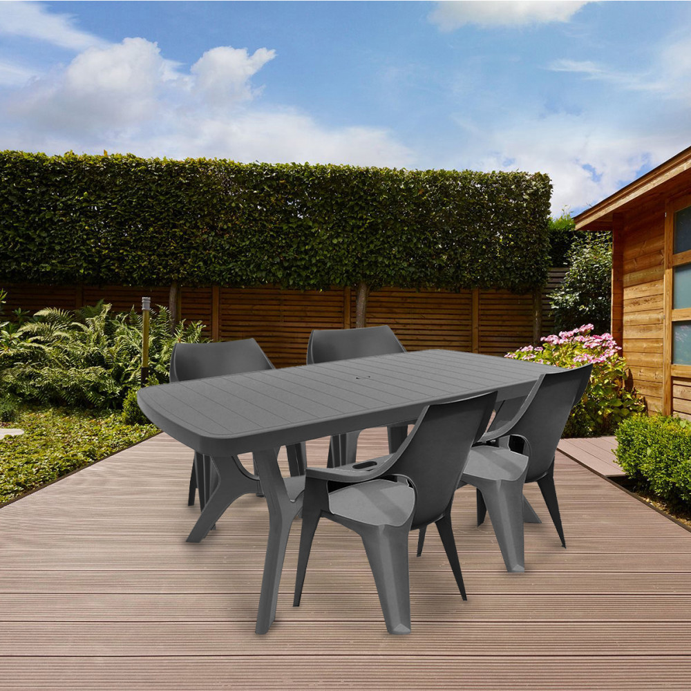 Az erős szerkezet és az elegáns, klasszikus kialakítás az asztal jellegzetes tulajdonságai. Ideális családi összejövetelekhez és baráti találkozókhoz. Az univerzális formatervezés lehetővé teszi az asztal különböző szék modellekkel való használatát. Tartós és ellenáll a környezetei kihatásoknak, valamint az UV sugárzásnak.