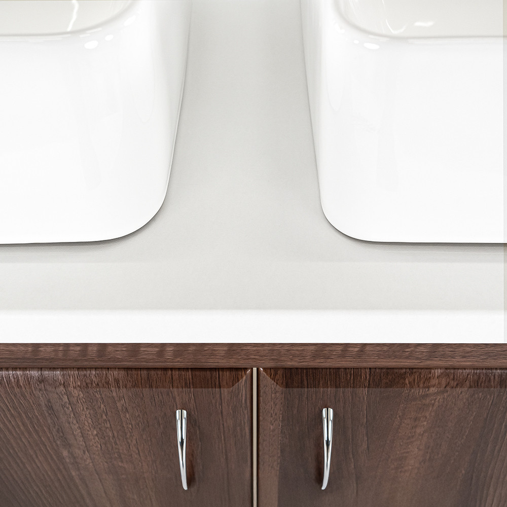 • Letisztult, Aida dió színű felület, fehér mosdópulttal.