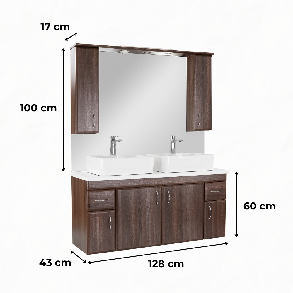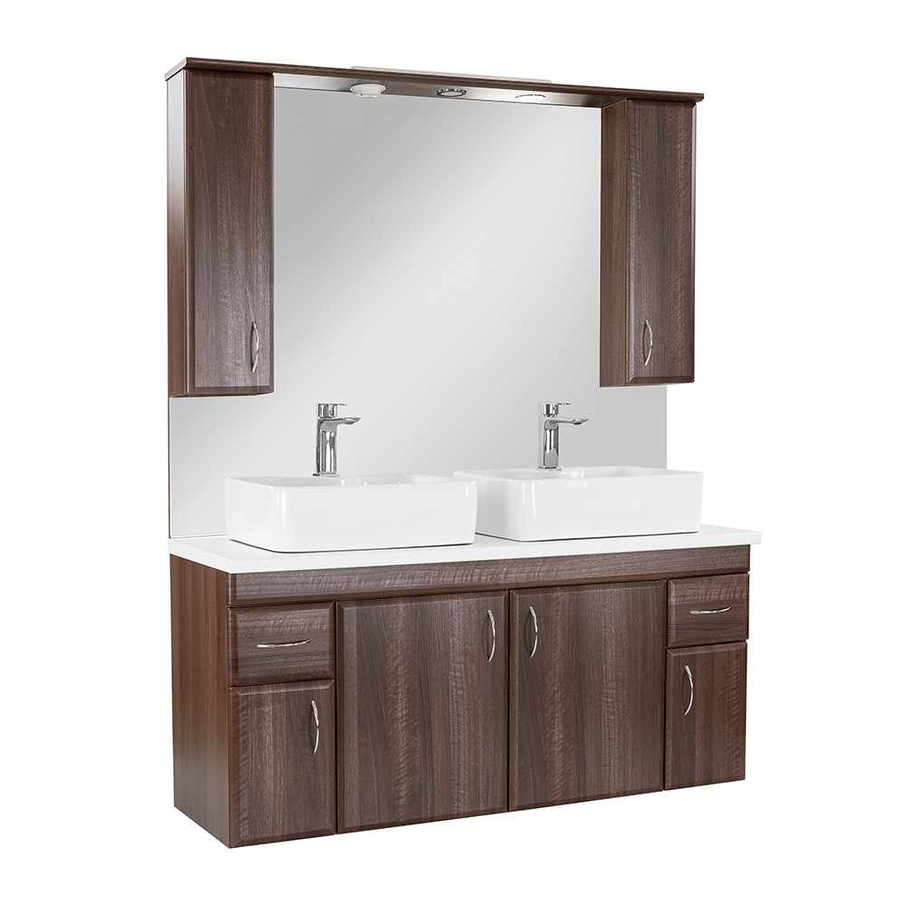 A Bianco 130 bútort a minimalista stílus és a praktikum jellemzi. A természetes hatású felület időtálló megjelenést biztosít, míg a 128 cm széles kialakítás két mosdónak is elegendő helyet kínál.