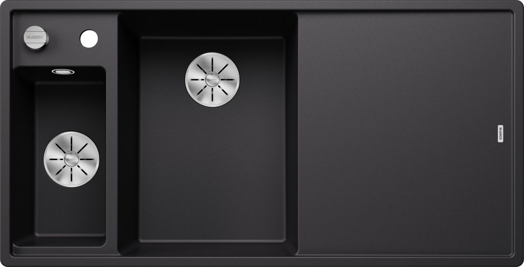Üveg vágólap, rozsdamentes multifunkciós tál, lefolyógarnitúra helytakarékos csővel, 2 x 3 1/2“-os InFino® szűrőkosár, lefolyó-távműködtető a főmedencéhez Folyamatos, ergonomikus munkafolyamatok két tengely mentén. Tiszta vonalak és kimondottan keskeny, lapos peremek határozzák meg a dizájnt. Keskeny rádiuszok a … Bővebben: BLANCO AXIA III 6 S bal fekete üveg tart.
