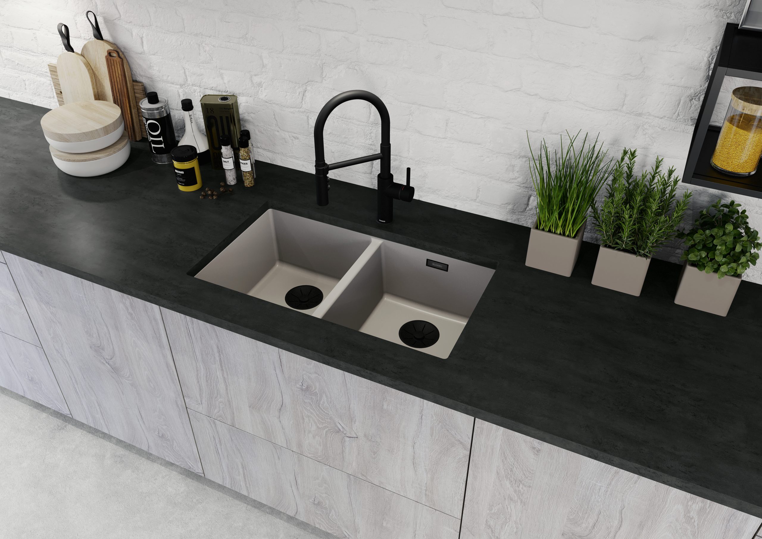 • Harmonizál a csaptelepek, mosogatószer-adagolók és dugókiemelőkkel matt fekete színben