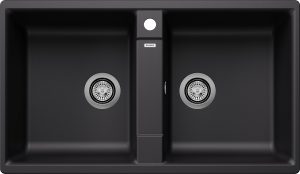 Lefolyógarnitúra helytakarékos csővel, 2 x 3 1/2'“-os szűrőkosár. Modern dizájn letisztult vonalakkal. Egyenes külső vonalak, hangsúlyos, keskeny kerettel. Tágas, kétmedencés mosogató a különböző feladatok egyidejű elvégzéséhez.