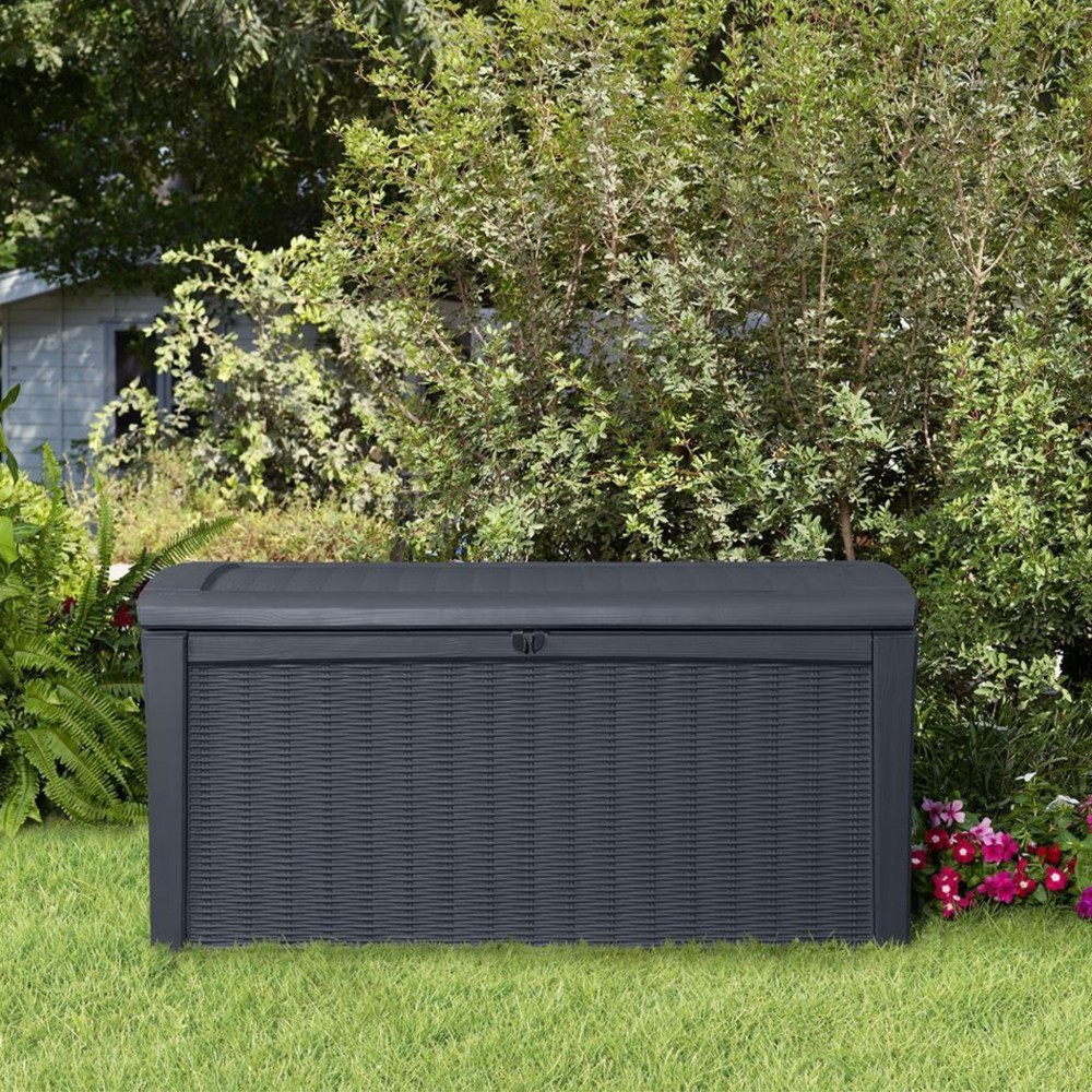 Elegáns és praktikus kültéri tárolási megoldás bármilyen kerthez vagy teraszhoz. A 416L Borneo tárolódobozt úgy tervezték, hogy bármilyen időben Megvédje a benne tárolt tárgyakat. Ezek mellett további előnye, hogy kerti padként is használható amin kétfelnött kényelmesén elfér. Imádni fogja az elegáns fonott / rattan stílusát, könnyű kinyitását és azt, hogy mennyire könnyű karbantartani.
