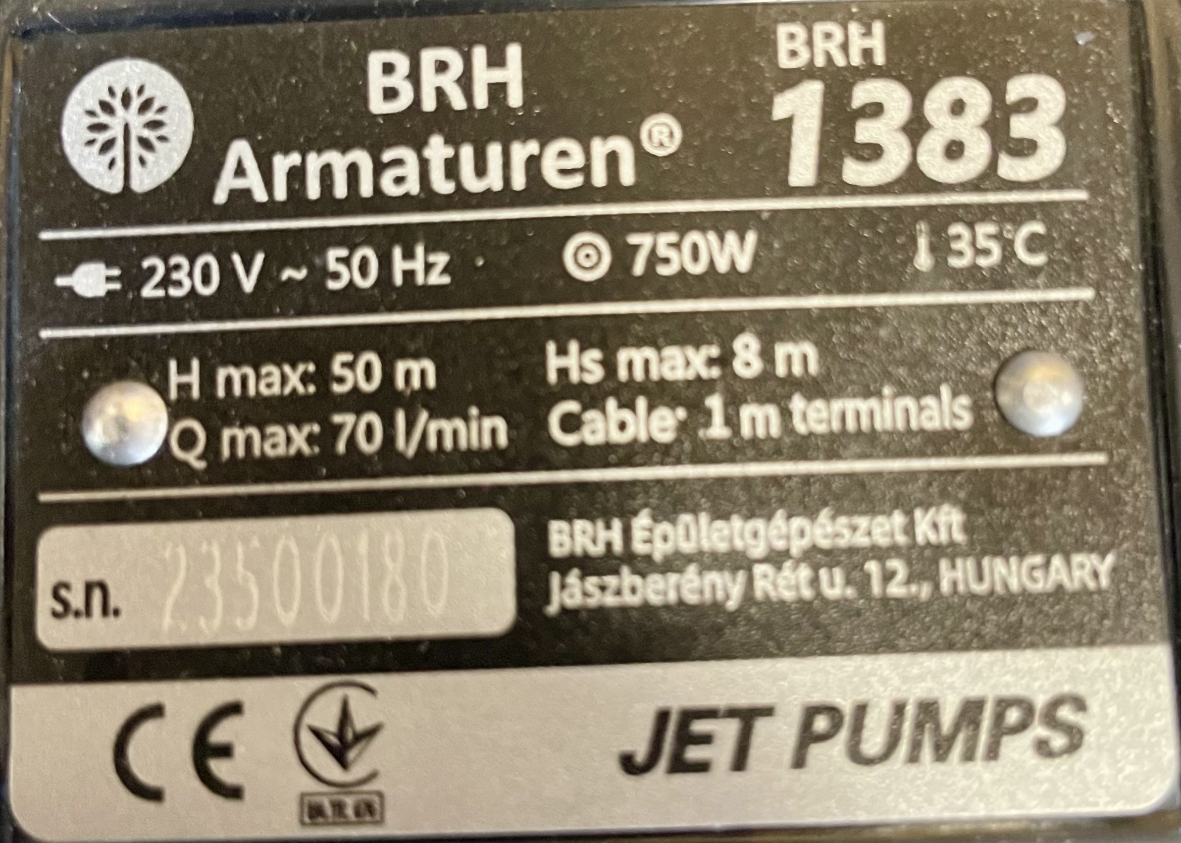 BRH JET típusdú, önfelszívó locsolószivattyú, telj.: 750W, csatl.:2×1″, Hmax:50m, Qmax: 70l/min