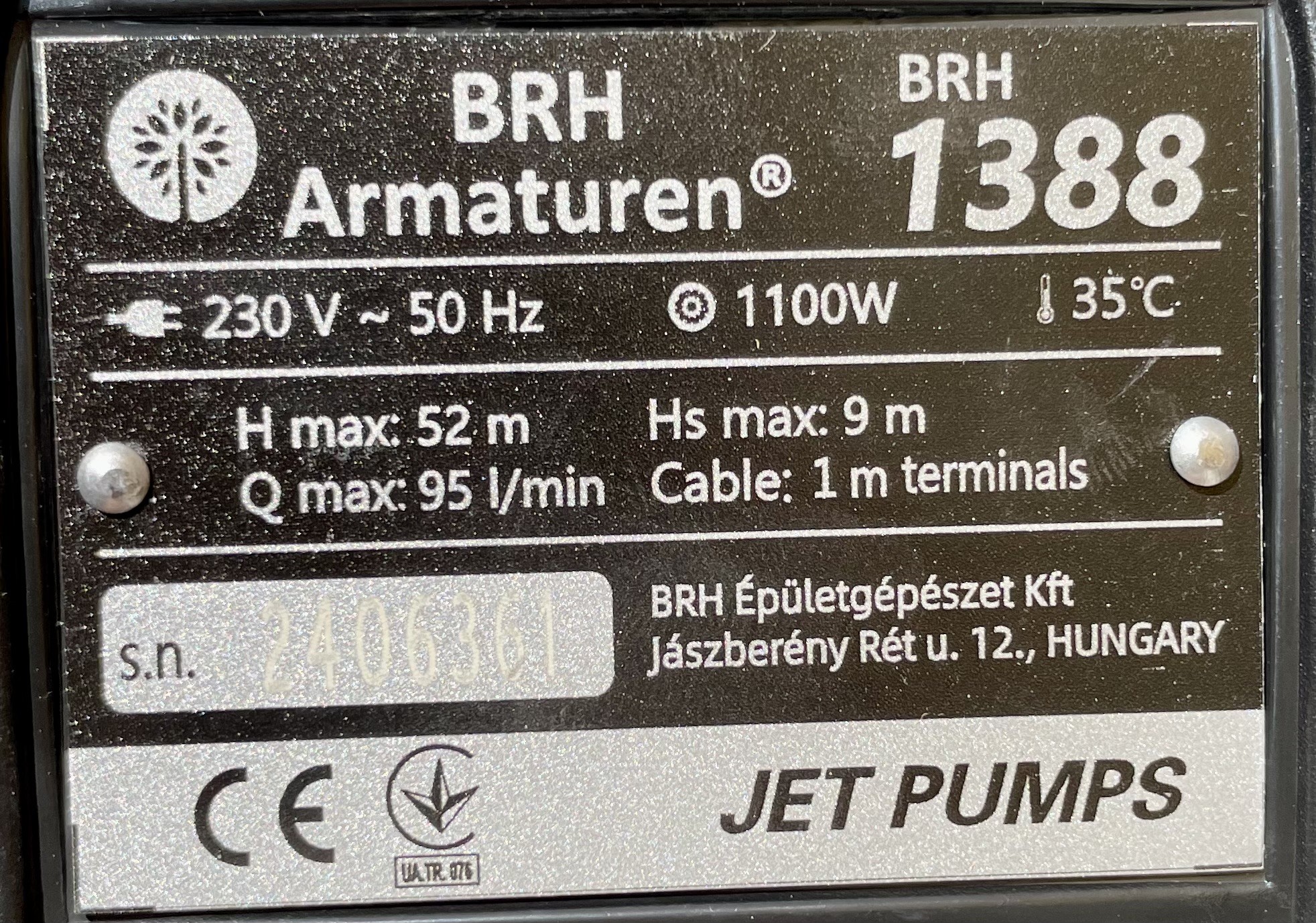 BRH JET típusú, önfelszívó locsolószivattyú, telj.: 1100W, csatl.5/4″-1″, Hmax:52m, Qmax: 95l/min