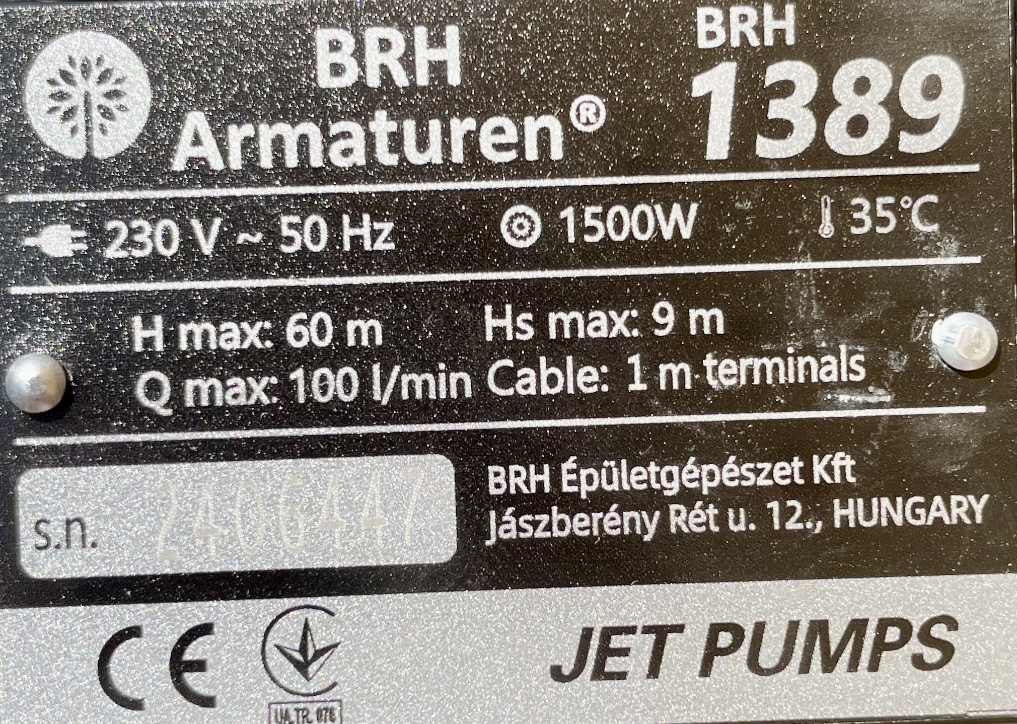 BRH JET típusú, önfelszívó locsolószivattyú, telj.: 1500W, csatl.5/4″-1″, Hmax:60m, Qmax: 100l/min
