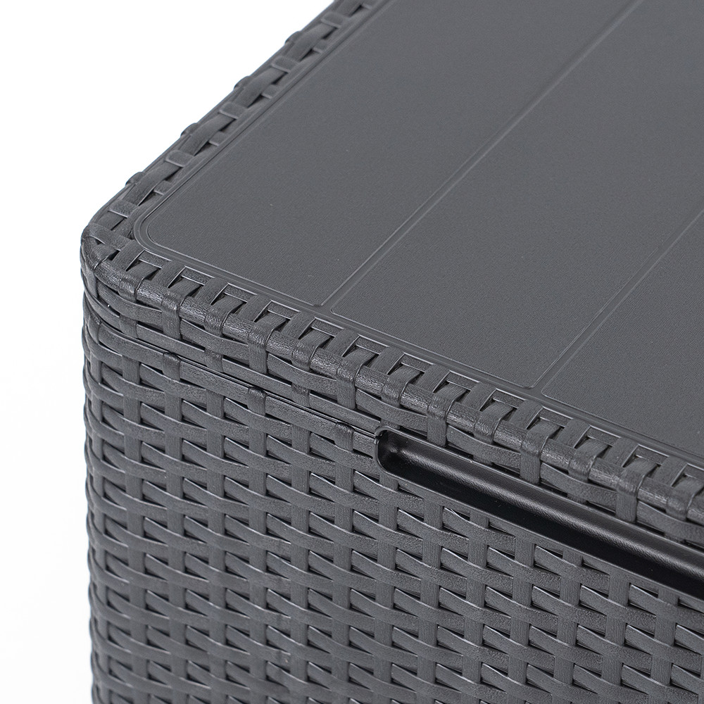 A garnitúrához tartozó párnatartós asztal nemcsak helytakarékos és praktikus, hanem stílusos kiegészítője is az ülőgarnitúrának. Tároló funkciója révén mindig kéznél tarthatod a párnákat vagy egyéb kültéri kiegészítőket.