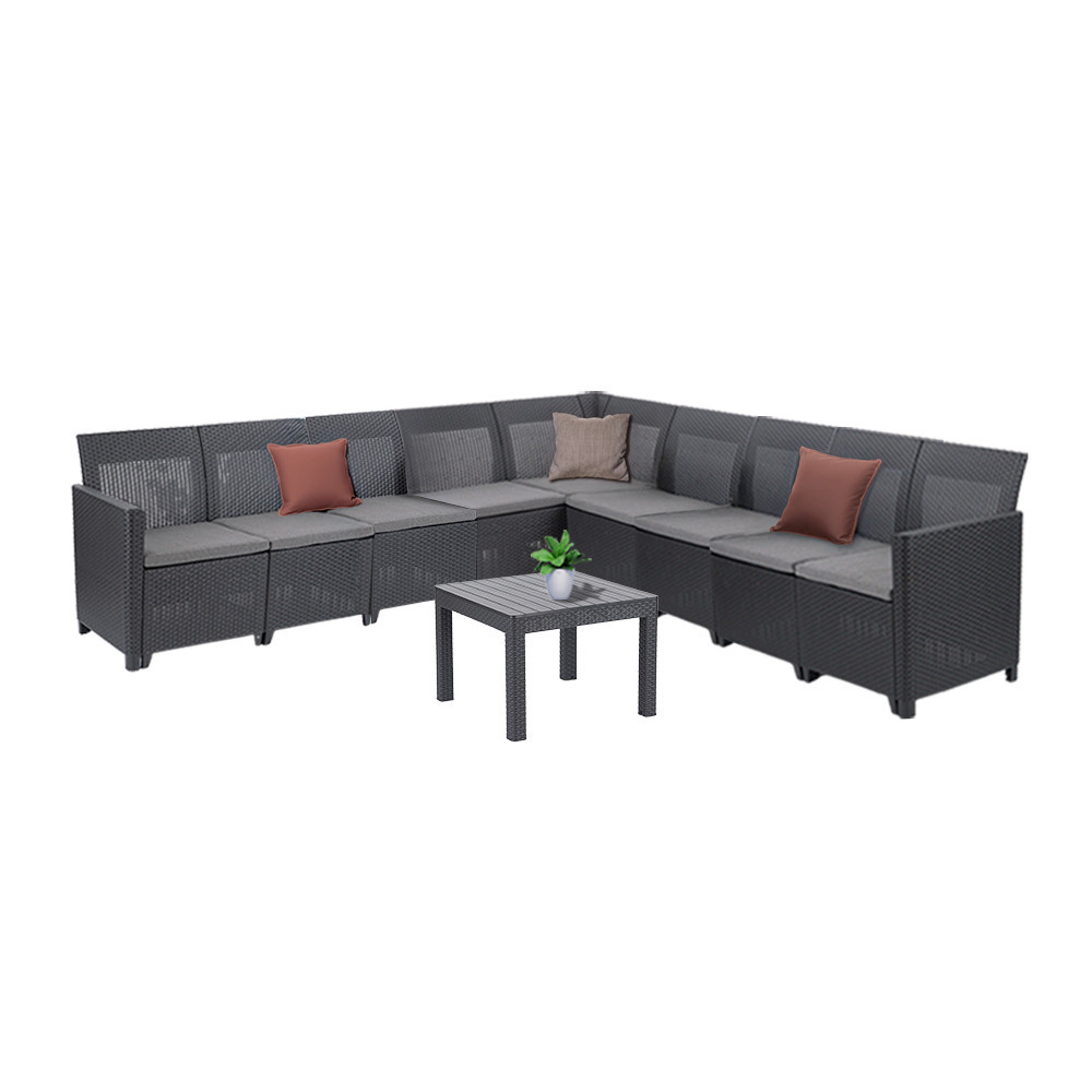 A garnitúra strapabíró, újrahasznosított műanyagból készül, amit úgy formáztak, hogy rattan hatású legyen, így hozva létre a stílus és a tartósság egyensúlyát. A párnák és a váz könnyen illeszthető, bővíthető rendszerben működnek – így biztosítva a teljes szabadságot és hosszú élettartamot.