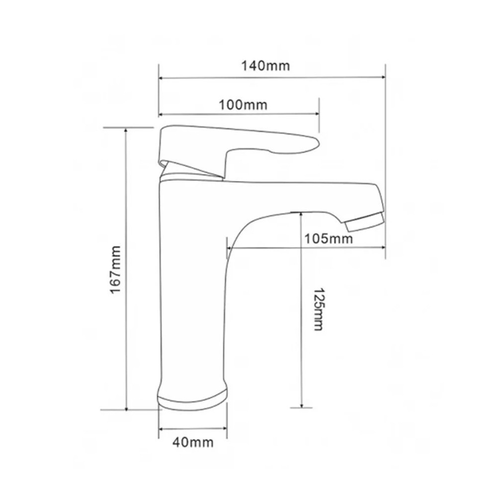 • Méretek: teljes magasság 167 mm, kifolyó magasság 125 mm, kifolyó hossz 105 mm, teljes hossz 140 mm, talpátmérő 40 mm