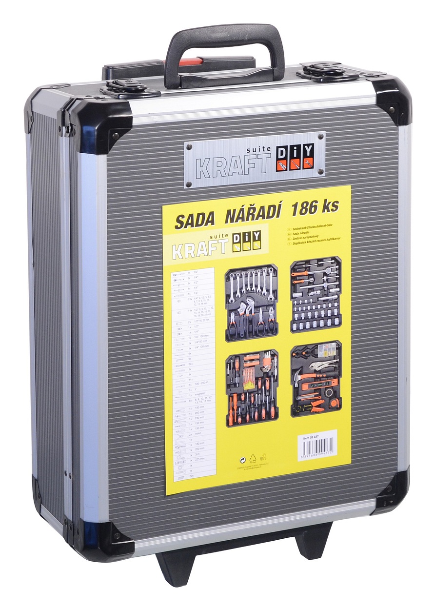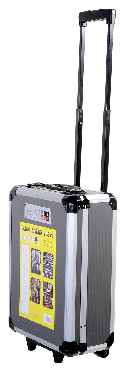 A Compass KRAFT SUITE alumínium koffer 186 darab szerszámot és csatlakozó anyagot tartalmaz. A 36 x 51 x 20 cm méretű szerszámos láda teleszkópos fogantyúval és kerekekkel van felszerelve.