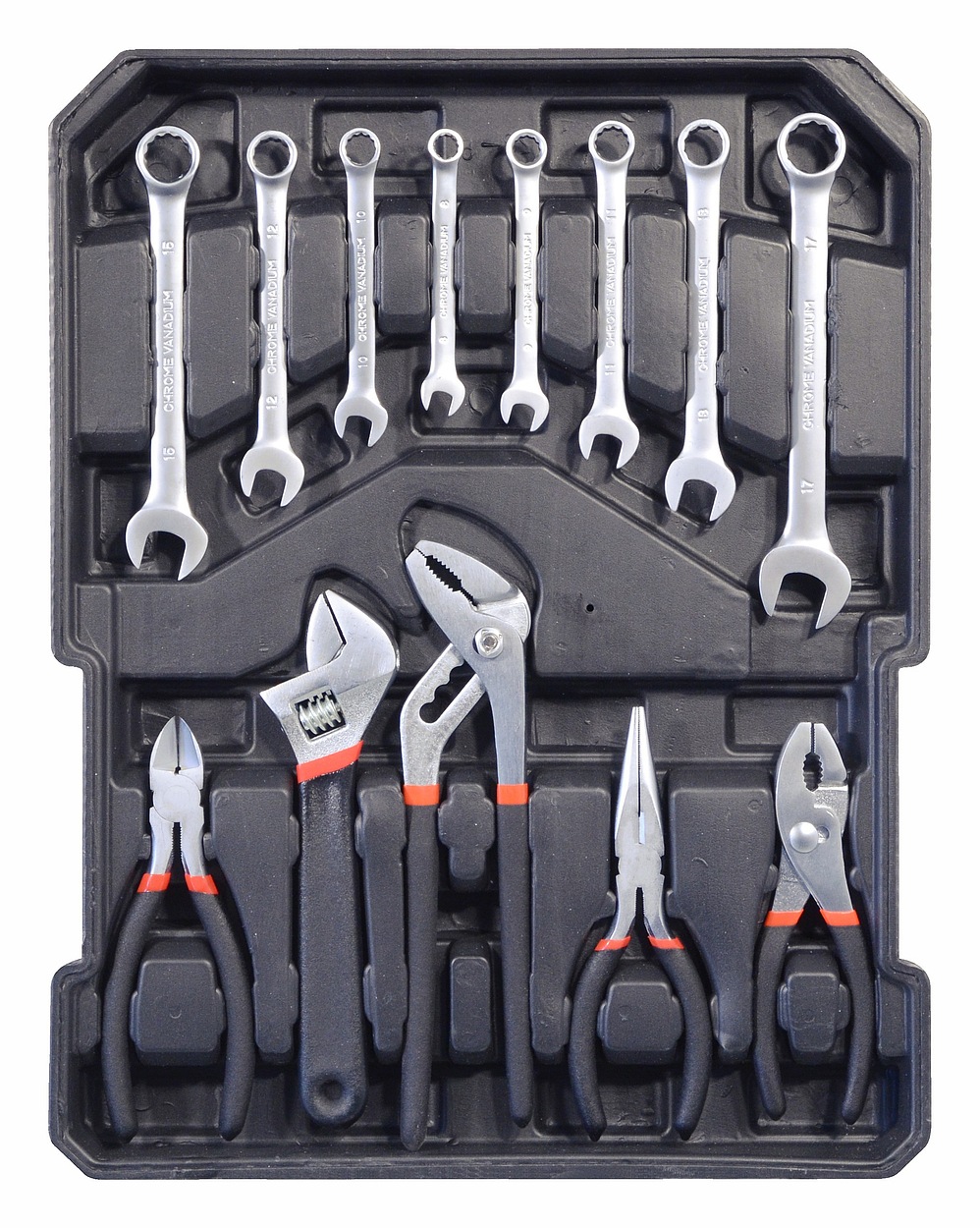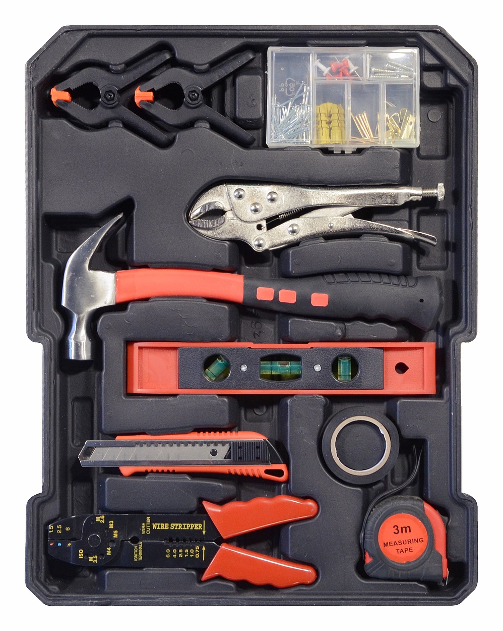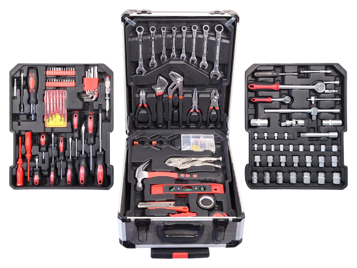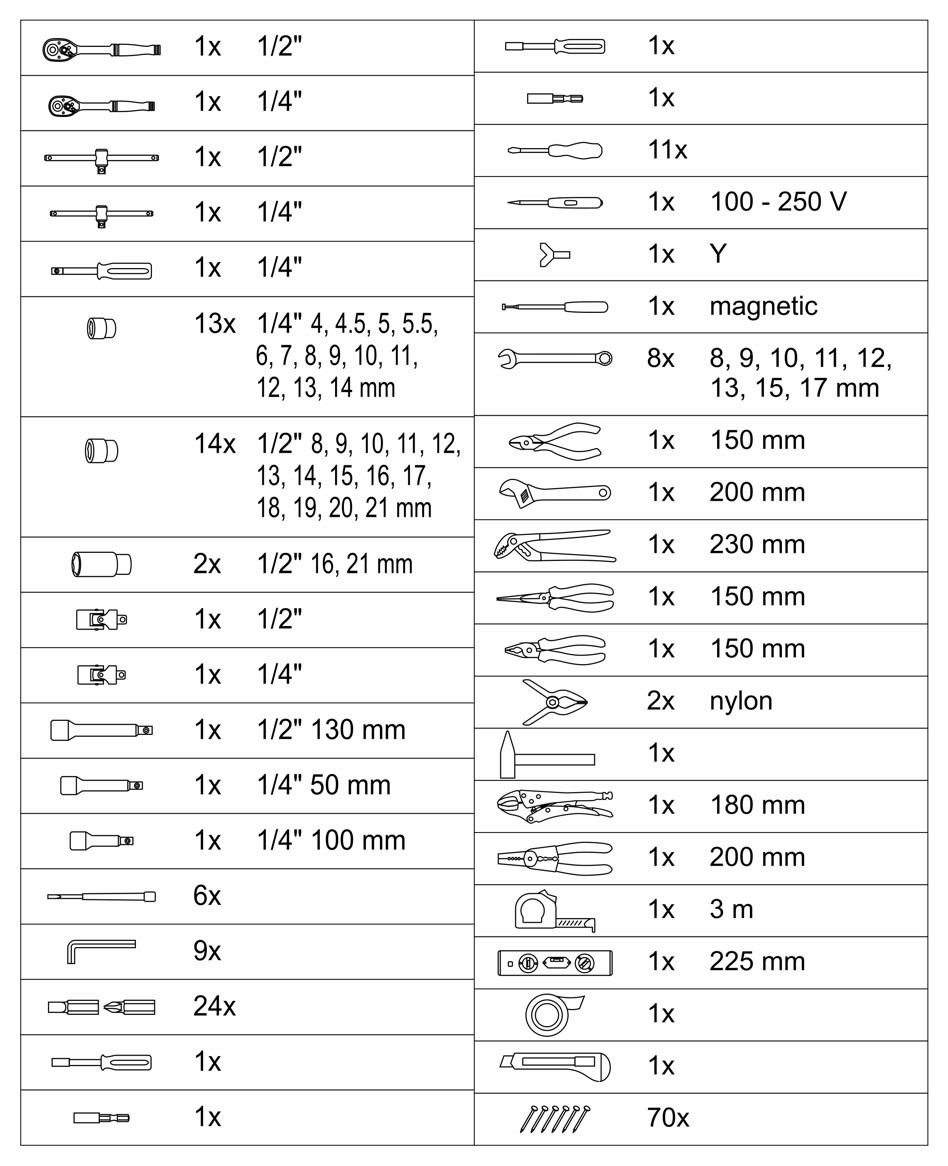 A készlet különféle fogókat, csavarhúzókat, villáskulcsokat, kalapácsot és egyebeket tartalmaz. A minőséges szerszámokat és alapvető csatlakozó anyagokat tartalmazó szerszámos láda elengedhetetlen segítője minden otthonnak és otthoni barkács műhelynek.