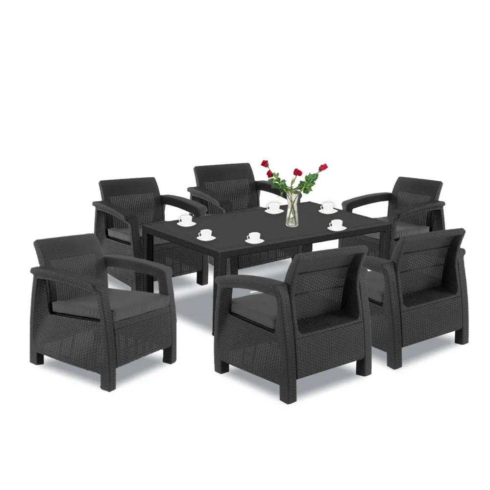 A stílusos Big duo szabadidő bútor szett maximális kényelmet garantál a felhasználók számára. A szettet modern dizájn jellemez, melyet természetes rattan fonás inspirált. A szett stabilitását és kényelmét szolid felépítésének és átgondolt szerkezetének köszönheti. A bútor szett hat egyszemélyes fotelt és egy asztalt tartalmaz. A Big termékvonal – kényelmes párnákkal kapható. A bútorok ellenállnak az időjárás viszontagságainak és az UV sugárzásnak.A bútorokat a Curver gyártja, kiknek termékei megtalálhatóak még Keter márkanév alatt is. A Big egy kiváló minőségű európai termék, amely a legjobb minőségű fröccsöntött műanyagból készült.