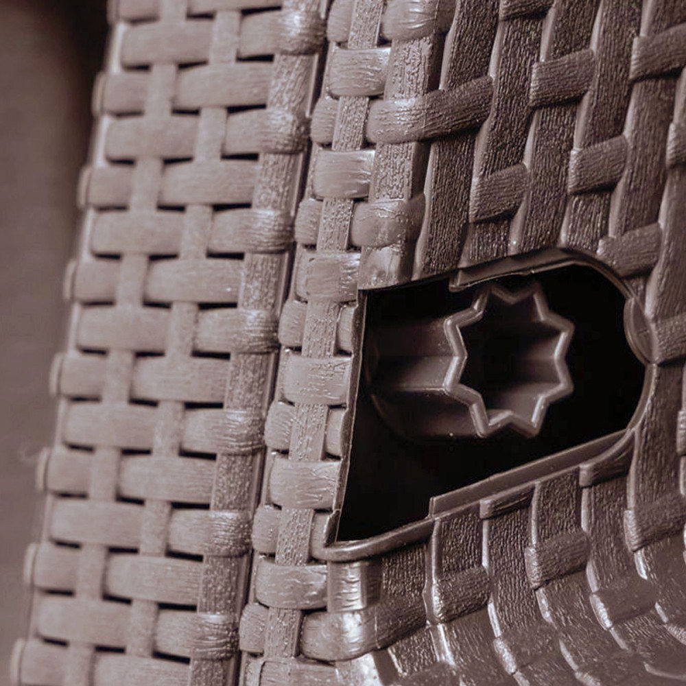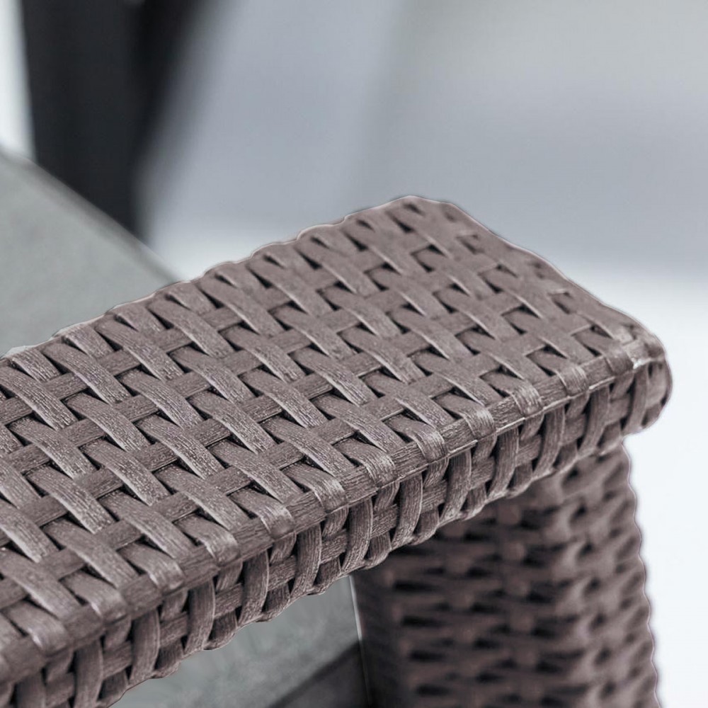 A bemutatott készlet megvalósítása – polyrattan utánzása. A bútorok anyaga tökéletesen utánozza a polirattant – valójában nehéz megkülönböztetni a valódi fonattól. A polipropilén mellett a gyárilag préselt polipropilén időjárásálló. Az erős napsütésben is védett a fakulás ellen, köszönhetően annak, hogy a polipropilén ellenáll az UV sugárzásnak . Ebből az anyagból készült bútorokat szintén nagyon könnyű tisztán tartani. Kis mennyiségű mosószer vagy akár nedves ruha is elegendő a makacs foltok megszabadításához.