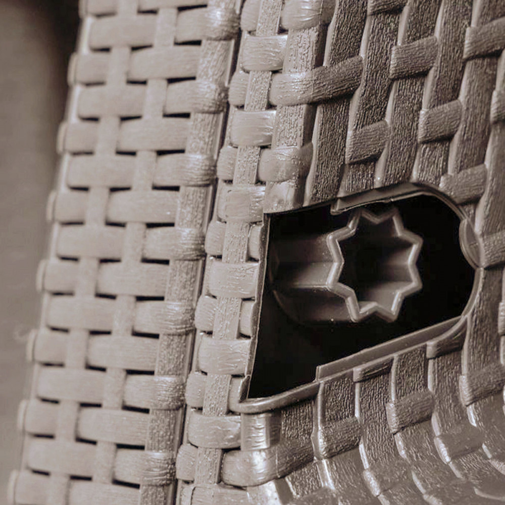 A bemutatott készlet megvalósítása – polyrattan utánzása. A bútorok anyaga tökéletesen utánozza a polirattant – valójában nehéz megkülönböztetni a valódi fonattól. A polipropilén mellett a gyárilag préselt polipropilén időjárásálló. Az erős napsütésben is védett a fakulás ellen, köszönhetően annak, hogy a polipropilén ellenáll az UV sugárzásnak . Ebből az anyagból készült bútorokat szintén nagyon könnyű tisztán tartani. Kis mennyiségű mosószer vagy akár nedves ruha is elegendő a makacs foltok megszabadításához.