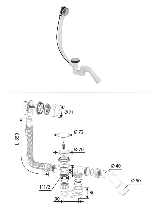 CR Automata kádleeresztő szifon- KRÓM túlfolyóval – átm. 70 mm KRÓM takaróval – 55 cm x 40/50mm