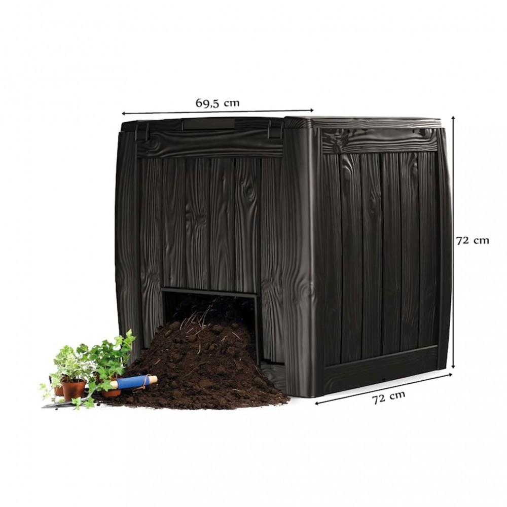 A Keter Deco Composter talppal tökéletes megoldás azok számára, akik a ttörődnek a környezettel és a kertészek számára, akik egyszerűen értékelik a természetes műtrágyát. A Keter magas színvonalú produkciójának köszönhetően a komposztor jól működik, megvédi a belső tereket a külső tényezőktől, és ezzel egyidejűleg elnyomja a rossz szagokat is.