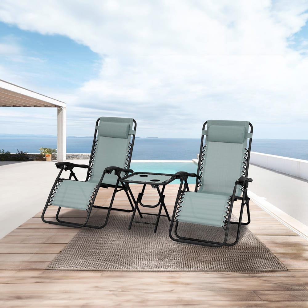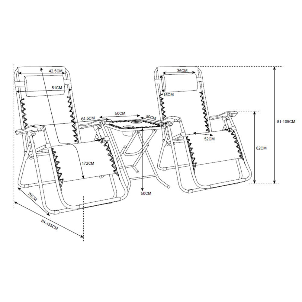 • Két összecsukható kerti nyugágy asztallal praktikus megoldást kínál a pihenésre bárhol – a teraszon, a kertben, a strandon, kempingben
