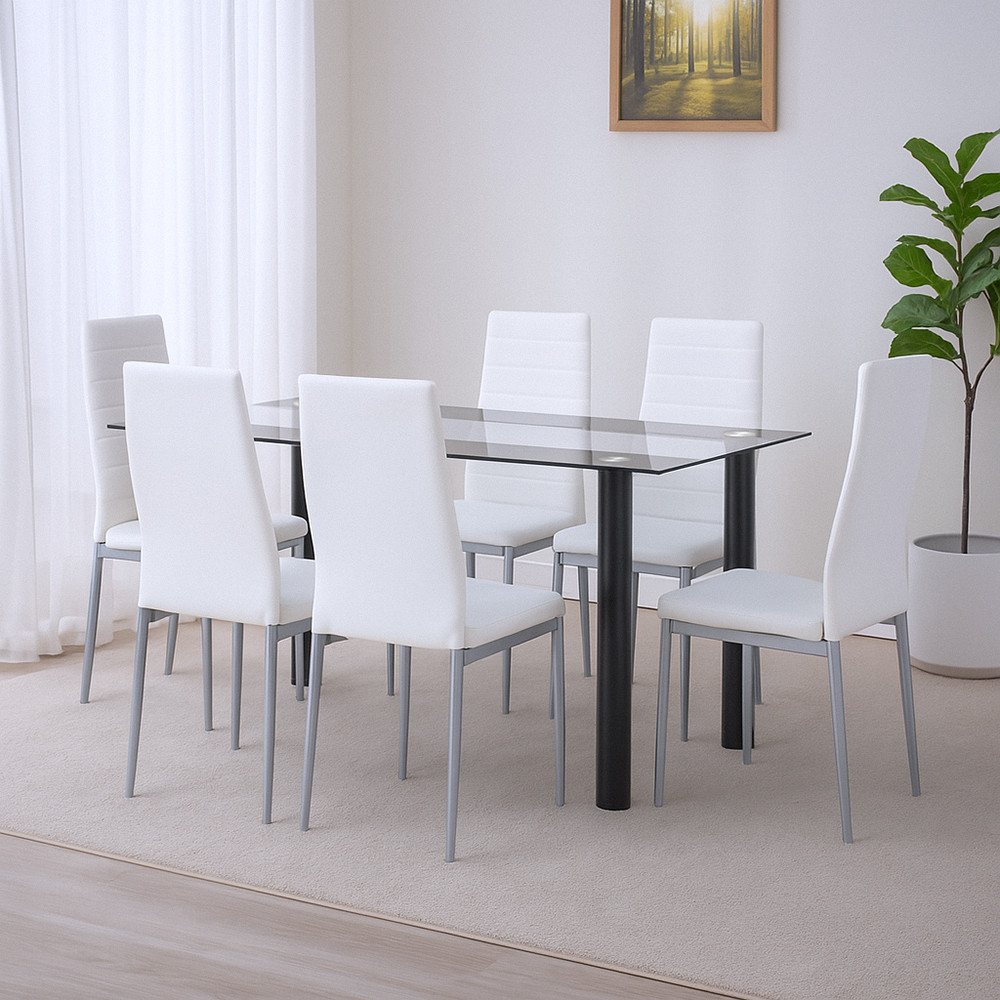 A fehér-szürke színkombináció remekül harmonizál a füstszürke üvegasztal színvilágával, így a teljes szett vizuálisan is egységes és kiegyensúlyozott.