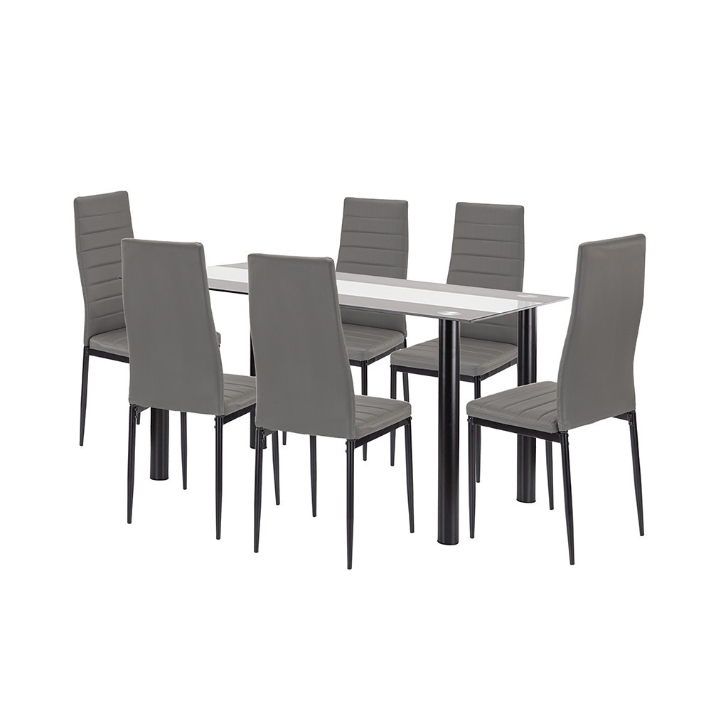 A szürke-fekete színkombináció remekül harmonizál a füstszürke üvegasztal színvilágával, így a teljes szett vizuálisan is egységes és kiegyensúlyozott.