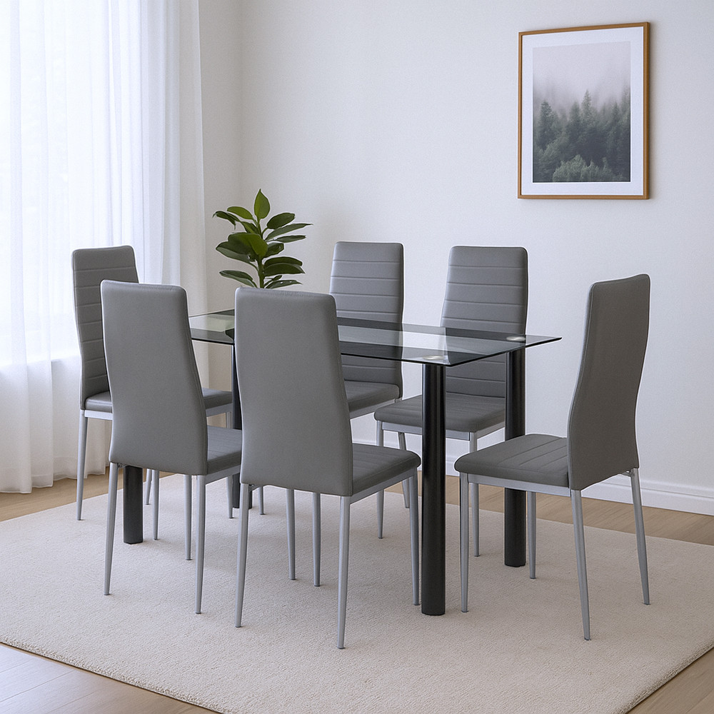 A szürke remekül harmonizál a füstszürke üvegasztal színvilágával, így a teljes szett vizuálisan is egységes és kiegyensúlyozott.