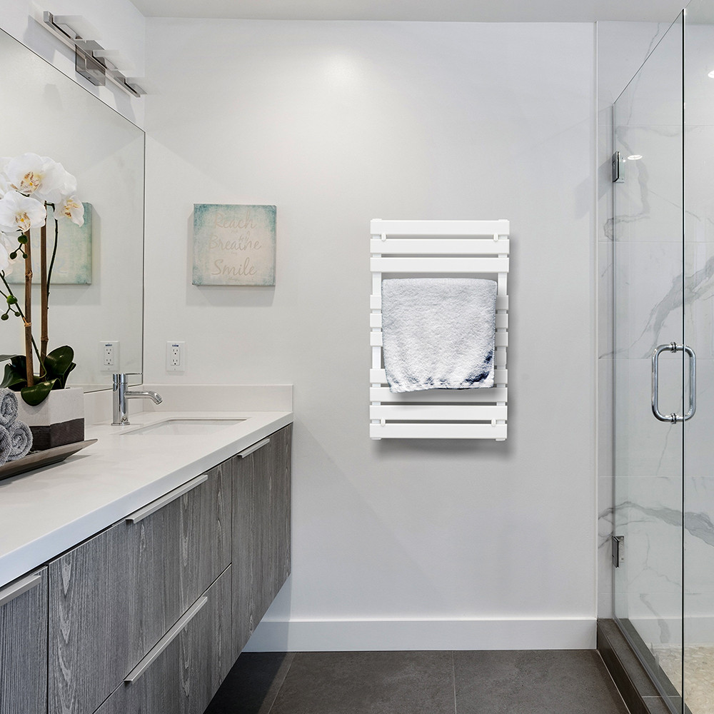 Az elektromos törölközőszárító radiátorunk, melynek teljesítménye 500W, elegáns fehér színben kapható, tökéletes választás bármely modern fürdőszobához.