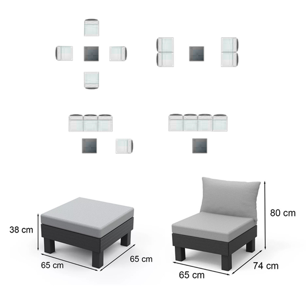 A Keter Elements V 4 személyes kerti bútor garnitúra elegáns és praktikus megoldás minden kültéri térbe. A grafit színű váz és a világosszürke párnák időtlen stílust képviselnek, amelyek modern, letisztult megjelenést kölcsönöznek a teraszodnak, erkélyednek vagy kerti pihenőhelyednek.