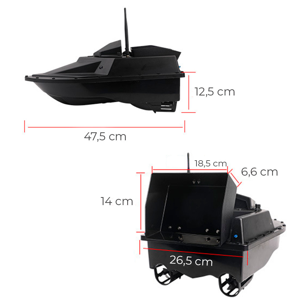 A fekete testű etetőhajó formatervezett kialakítása nemcsak modern megjelenést nyújt, hanem kiválóan ellenáll a fröccsenő víznek és a kisebb hullámzásnak is. A hátsó ürítési mechanizmus egyszerűen kezelhető, így gyorsan és pontosan lehet etetni bármilyen horgászhelyen.