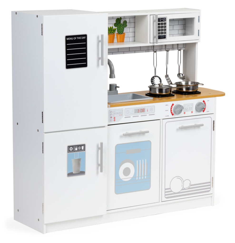 Minden gyerek szeret utánozni a felnőtteket, ennek a konyhának köszönhetően gyermekednek lehetősége lesz eljátszani a szakács szerepét. A szakácsnak többek között forgatógombos égők állnak rendelkezésére a megfelelő hőmérséklet beállításához. A pult alatt található egy sütő és egy mosogatógép. A felső részben található egy **nyitható mikrohullámú sütő** és egy további polc az evőeszközöknek. Természetesen a konyha nem nélkülözheti egy tágas **hűtőszekrényt** fagyasztóval és egy helyet a bevásárlólista feljegyzésére.