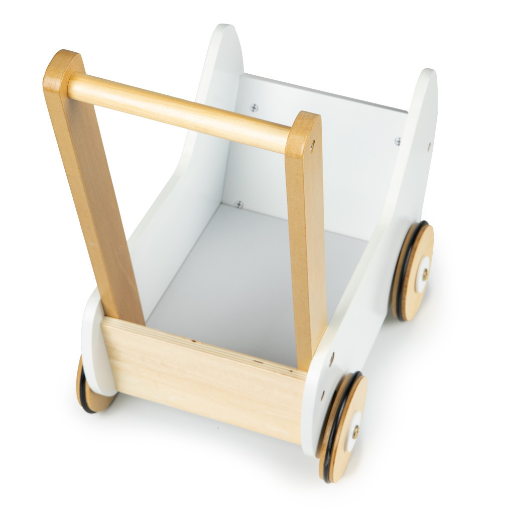 A babakocsi teljes egészében fából készült és gyermekbiztos festékkel van bevonva. A stabil szerkezet mentes az éles szélektől és a veszélyes elemektől, így nem kell aggódnod gyermeked biztonsága miatt játék közben.