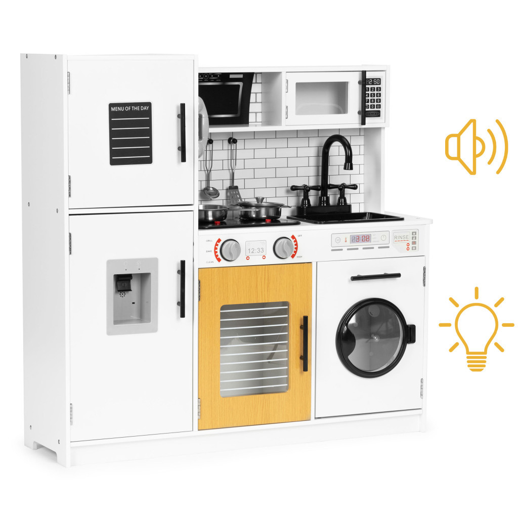• A konyhában játék égők is találhatók, amelyek vizuálisan egy igazi indukciós főzőlapra hasonlítanak. Ezeknek köszönhetően a móka még lebilincselőbbé válik, és a készletben található kiegészítők nagyszerű kiegészítői, amelyek lehetővé teszik, hogy különféle ételeket főzzön és pirítson. A piros gombok megnyomásával bekapcsoljuk a tűzhely égőfejeit, amelyek világítanak és sütési hangot adnak ki.