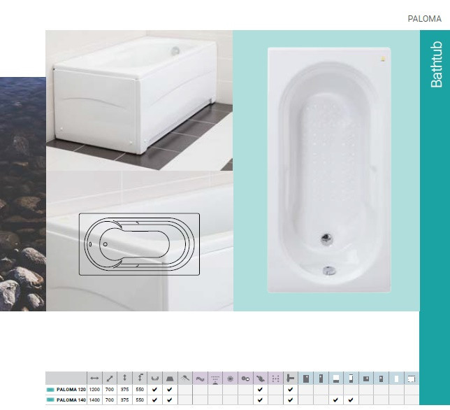 Paloma 120×70 cm-es egyenes akril kád, amely speciális csúszásmentes kádbelsővel rendelkezik, valamint a belső kikepzésének köszönhetően kényelmes testhelyzetet biztosít. Minden fürdőkádunk fő jellemzője a magasfokú kényelem és a minőség.Kádjaink felülete kellemes, meleg tapintású köszönhetően a 4 mm vastagságú akril rétegnek.Minden kádunk műgyanta-üvegszálas erősítéssel van ellátva, így kádjaink kiemelkedő hőszigetelő képeséggel rendelkeznek.