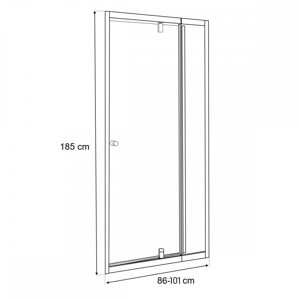 Önmagában is beépíthető zuhanyajtó, 86-101 cm között állítható a szélessége, 6mm-es biztonsági víztiszta üveggel, krómozott alumínium profilokkal és ajtófogantyúval rendelkezik.
