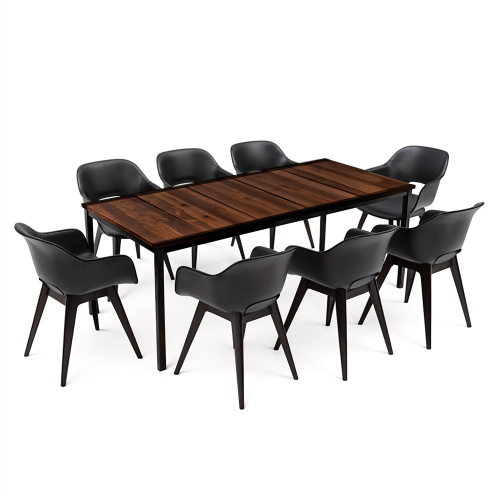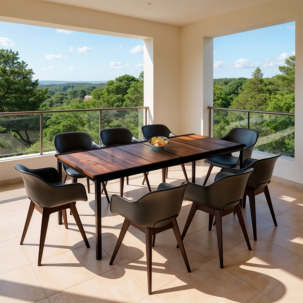A meleg, természetes dió tónusú asztallap és a hűvös grafit székek kontrasztja minden stílusú kültéri térben magára vonzza a tekintetet: skandináv, mediterrán vagy ipari környezetben is kifinomult megjelenést ad.