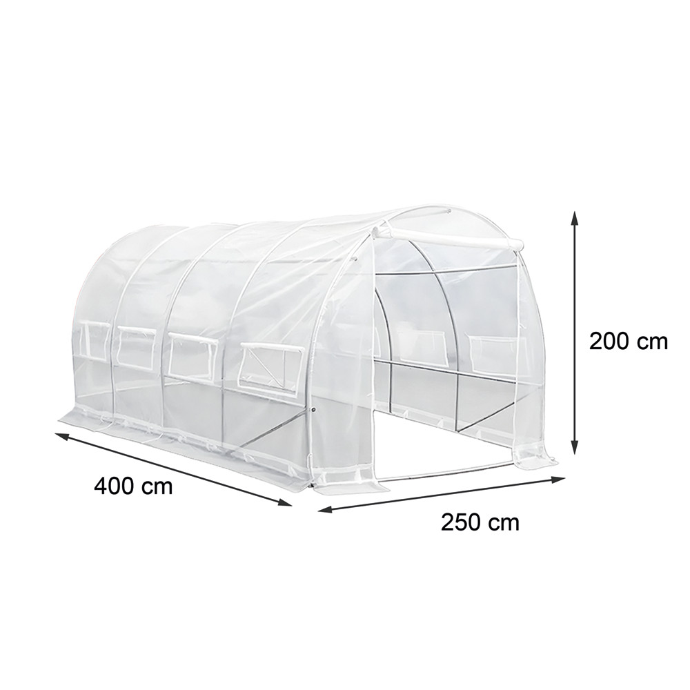 A fóliasátor 200x250x400 cm-es méretének köszönhetően bőséges helyet biztosít a növényeid számára. A tartós, UV-álló fólia garantálja a hosszú élettartamot és védelmet az időjárás viszontagságai ellen. A termék váz nélkül érkezik, így a fóliát könnyedén rögzítheted bármilyen kompatibilis szerkezetre vagy meglévő vázra. A modern fólia alagút felhúzható ajtóval rendelkezik, ami jelentősen növeli a használat kényelmét. Emellett 8 hálós ablak biztosítja a megfelelő levegő keringést, miközben hatékonyan véd a nem kívánt rovarok ellen. A fóliasátor könnyen telepíthető és karbantartható, így ideális választás szezonális használatra, és hatékonyan óvja növényeidet a túlzott napsugárzástól, esőtől és széltől.