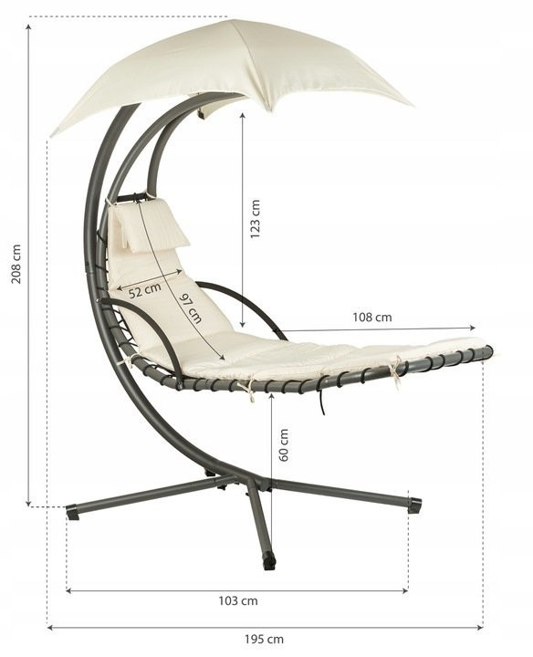 A függő nyugágy stabilitását és biztonságát jól megtervezett vázának köszönheti, amely sima hintázást és lengést tesz lehetővé. A nagy, állítható napellenző hűs árnyékot nyújt a forró napokon, míg a lágy lengő mozgás fokozza a pihenést. A vízálló, puha matrac fejtámlával igazán kényelmes pihenést biztosít.