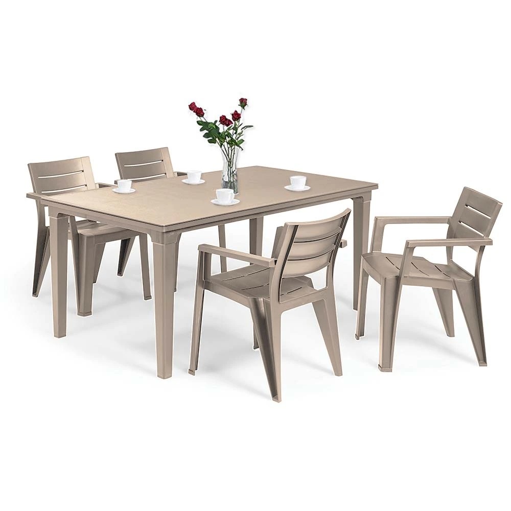 A Futura kerti asztal műanyagból, polipropilénből készül , ellenáll a kedvezőtlen időjárási viszonyoknak. Egész évben a szabadon állhat.Napfénynek kitéve nem halványul el és nem fakul. A Julie egy modern szék, amely a megfelelően profilozott háttámlájának köszönhetően rendkívül kényelmes. A bútor könnyű, szolid és ellenáll az időjárás viszontagságainak és az UV sugárzásnak. A székek egymásra helyezhetők, ami segít helyet megtakarítani és könnyebbé teszi a tárolását. A termék széles színválasztékban kapható.
