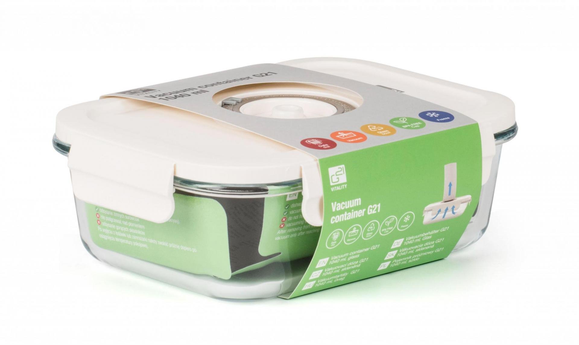 Élvezze az egyszerű és kényelmes vákuumozást friss vagy kész ételekhez a G21 1 040 ml-es vákuumos üvegedény segítségével. Meghosszabbítja az ételek eltarthatóságát, megőrzi frissességüket, természetes ízüket, illatukat és legfőképpen az értékes tápanyagokat. Az edény nagy előnye a sokoldalú felhasználás – hűtéshez, fagyasztáshoz és (tető nélkül) sütéshez is alkalmas.