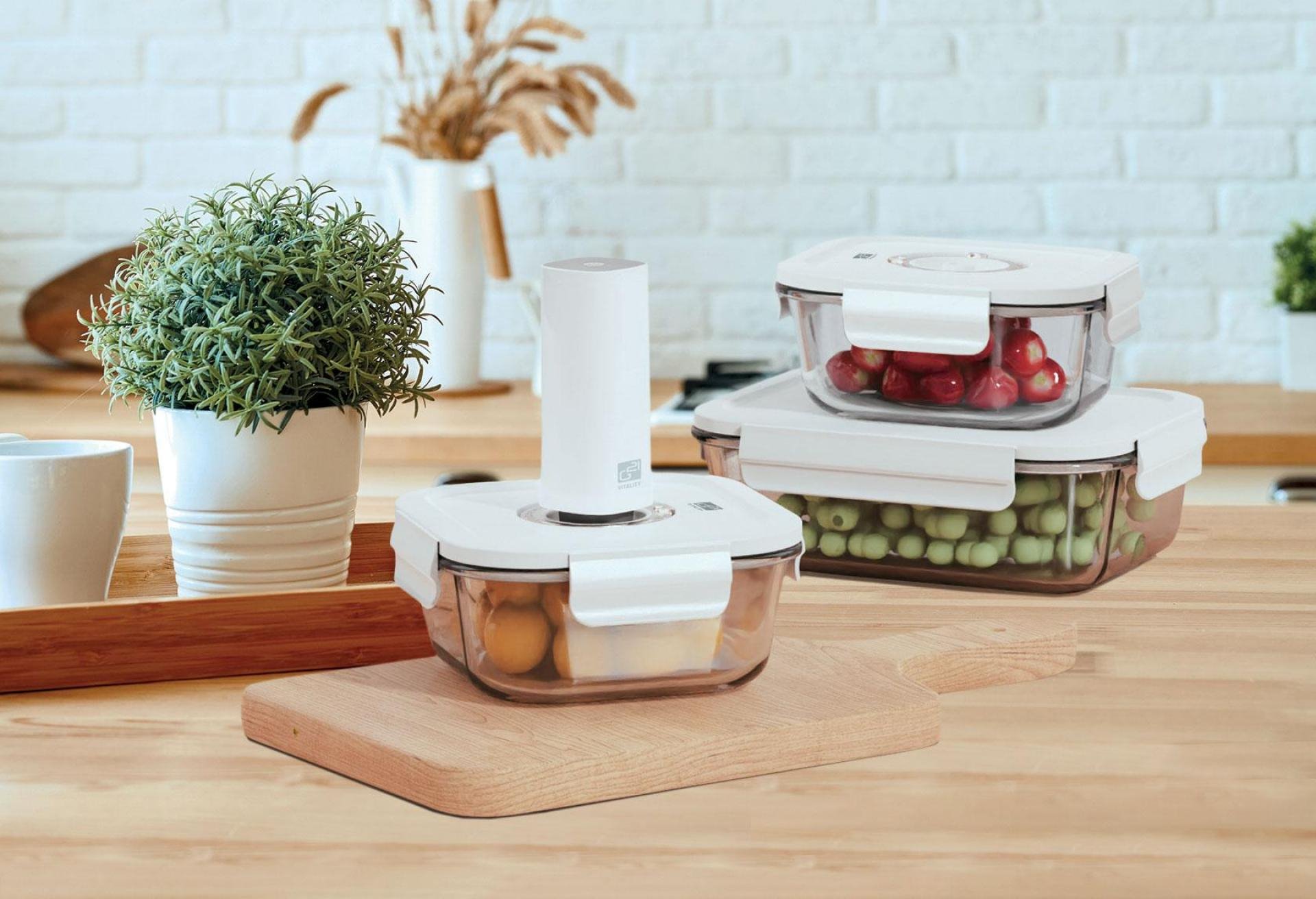 Az élelmiszerek eltarthatóságának meghosszabbítása és a frissesség megőrzése, vákuum, hűtés és fagyasztás, boroszilikát üvegtest, BPA-mentes fedél, dátumbeállítás, hőmérséklet-állóság -20 és +400 °C között.