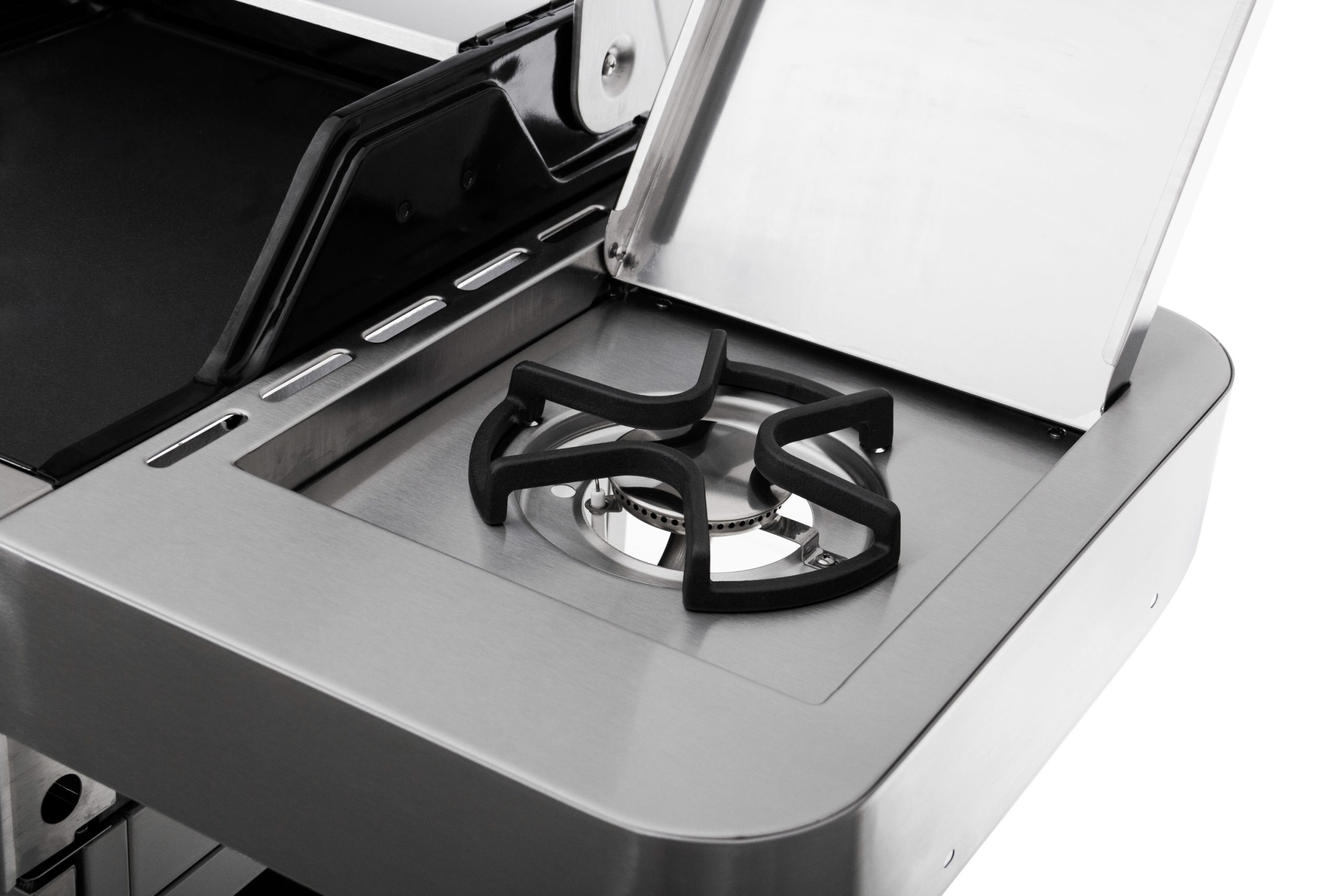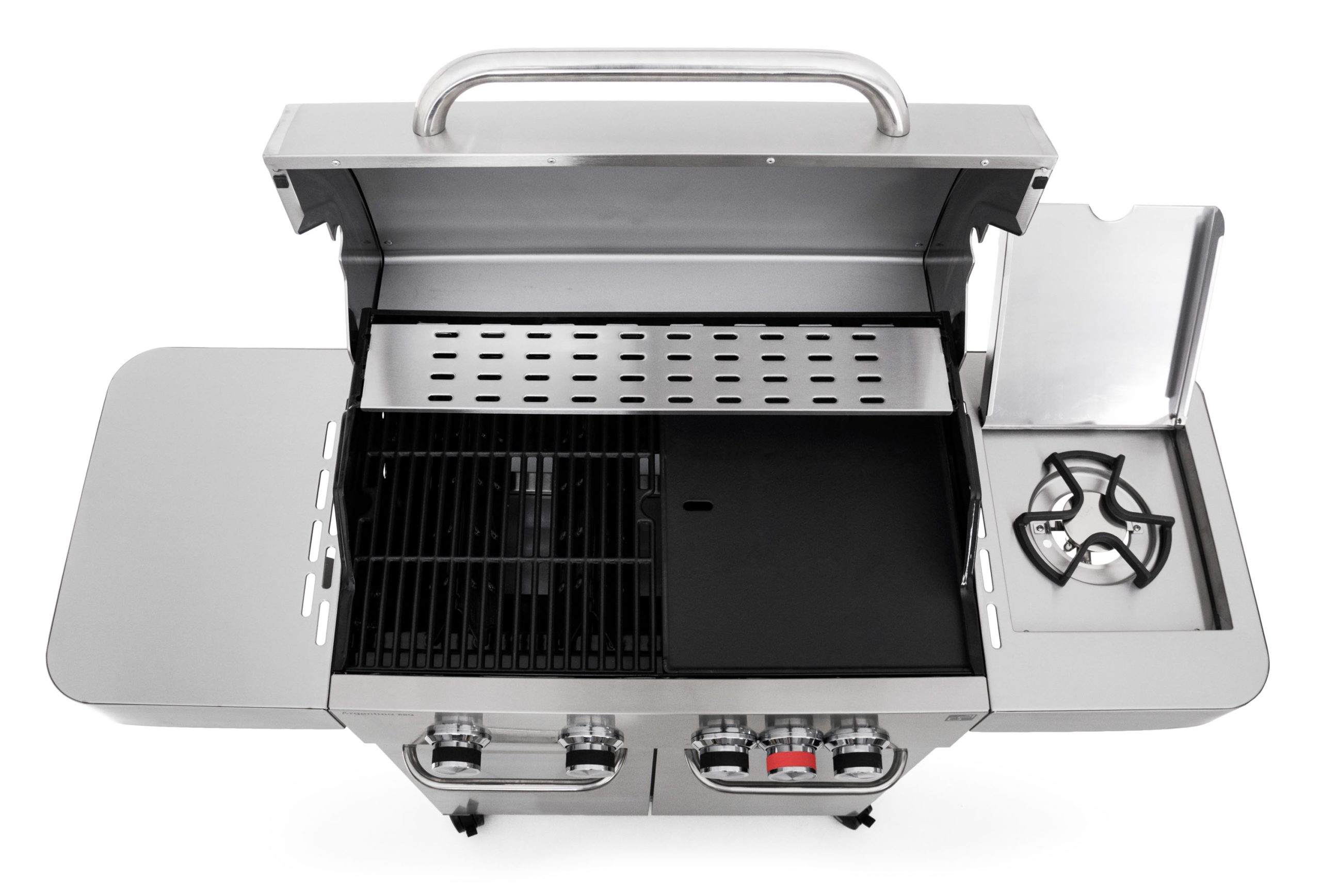 Igen, a G21 Argentina gázgrill nem csak négy fő grillező fejjel rendelkezik, hanem egy oldalsó égőfejjel is. Megtalálja a fedél alatt az oldalsó tároló felületek egyikén és használhatja sütésre, főzésre, például a köret elkészítésére serpenyőn vagy melegítésre.