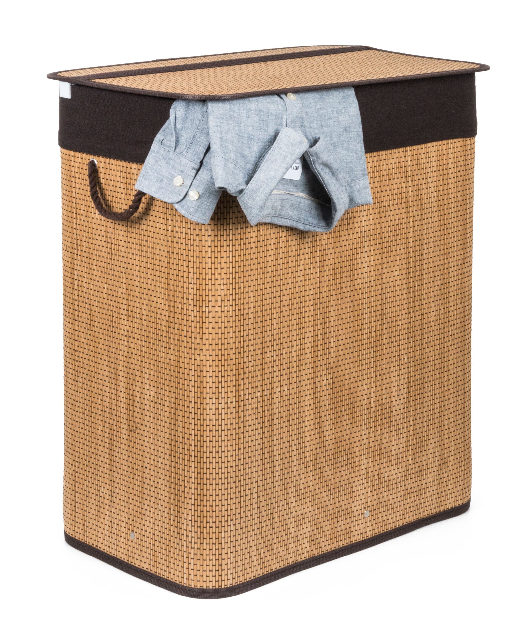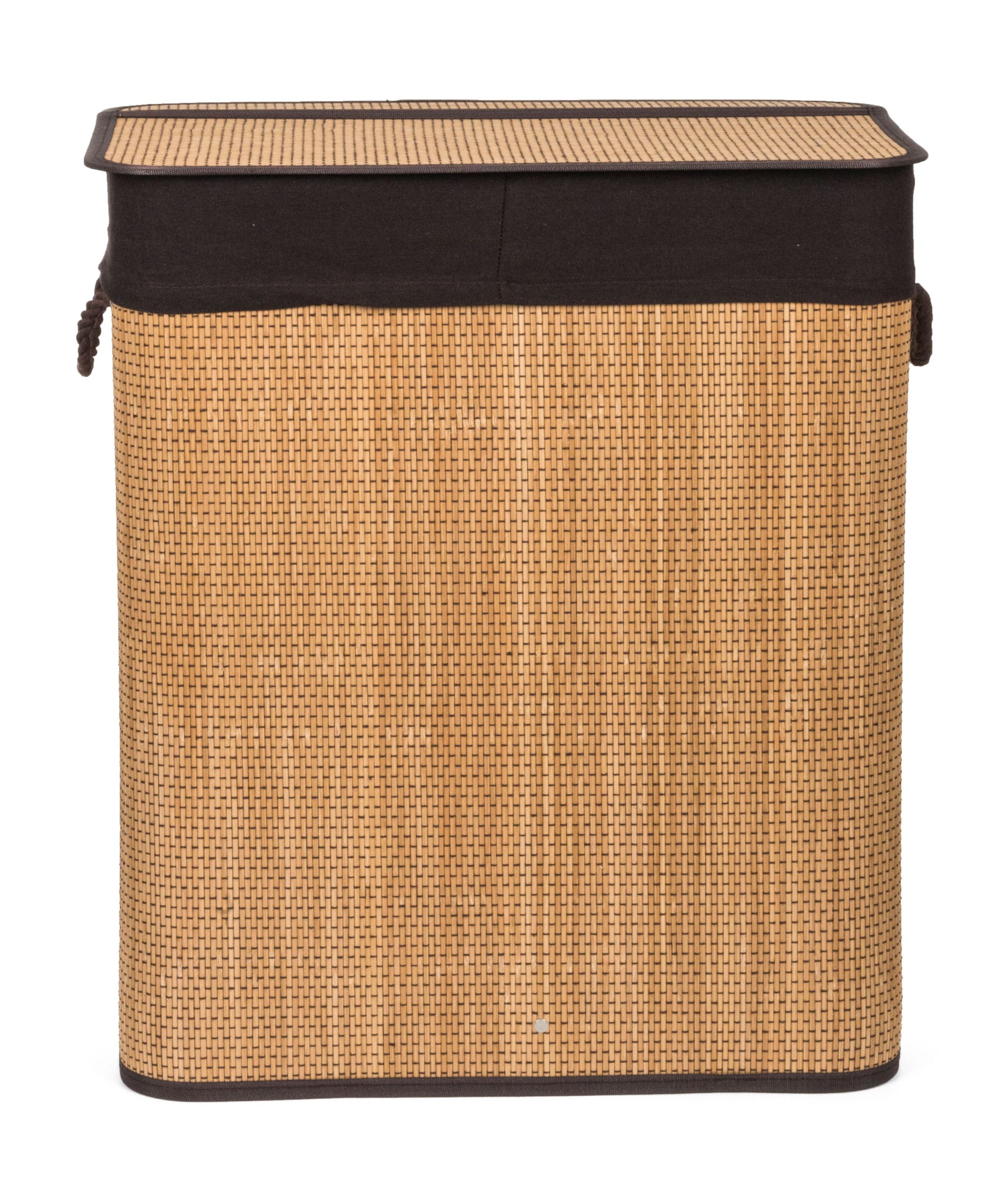 A G21 bambuszkosár , rögzített fedelű és mosható szövetbetéttel rendelkezik, két külön rekeszre osztva. Így mosás előtt szét válogathatja a piszkos ruhaneműt, és különálló darabokat helyezhet el anyagtól vagy színtől függően a kosárba .
