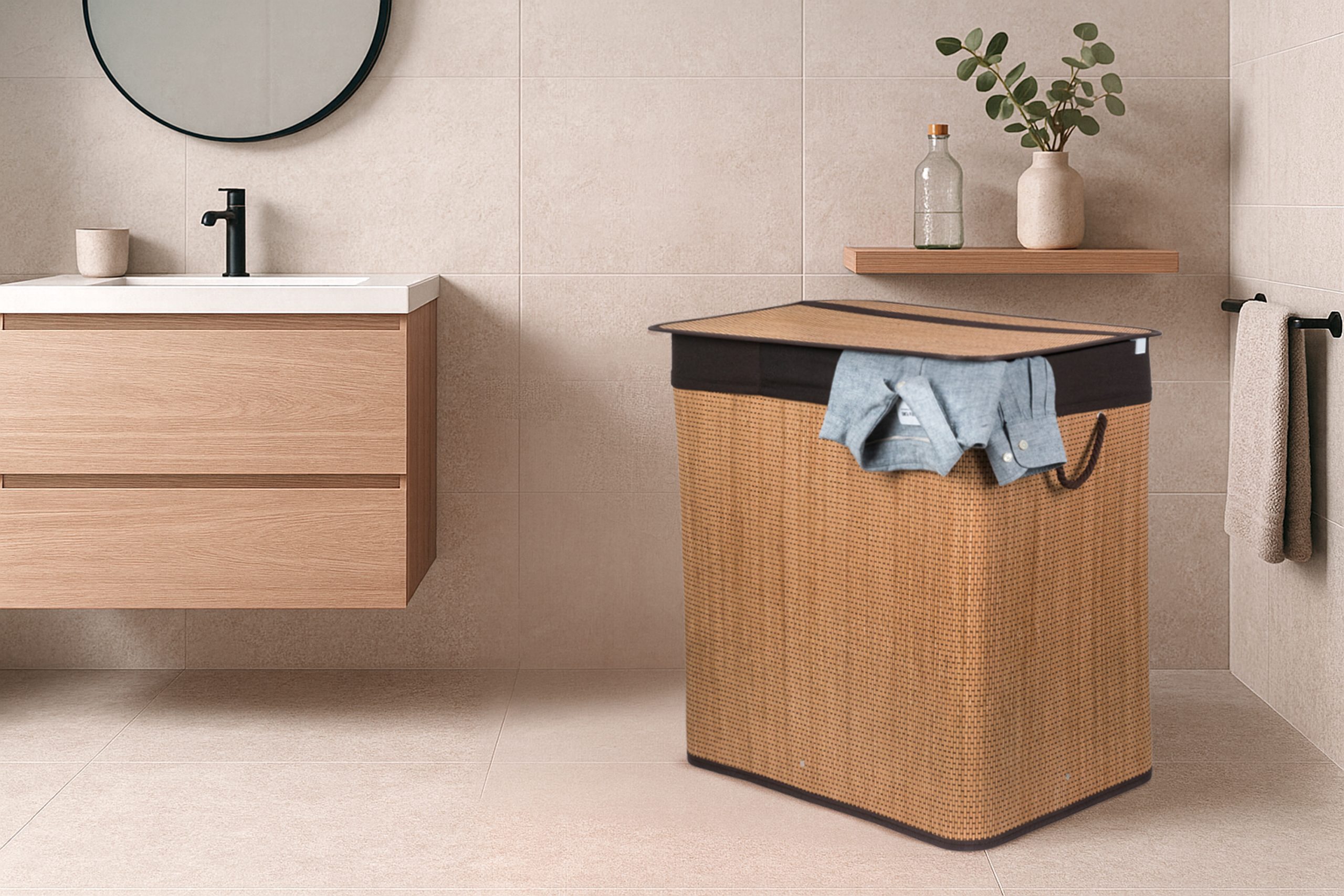 A bambusz meglepően könnyű, így könnyen hordozható. Ugyanakkor elég erős ahhoz, hogy nagy terhelést is kibírjon, ha megtöltjük ruhával. Ezenkívül a bambuszfa egyik kiváló tulajdonsága a magas nedvességállósága. Ha tehát olyan szennyeskosarat keres, amely nem adja meg magát a párás fürdőszobai környezetnek, akkor a 150 l űrtartalmú bambusz szennyeskosár a kézenfekvő választás.További előnye a természetes ellenállása a baktériumokkal és a penésszel szemben, ami nagyon előnyös egy szennyeskosárban.