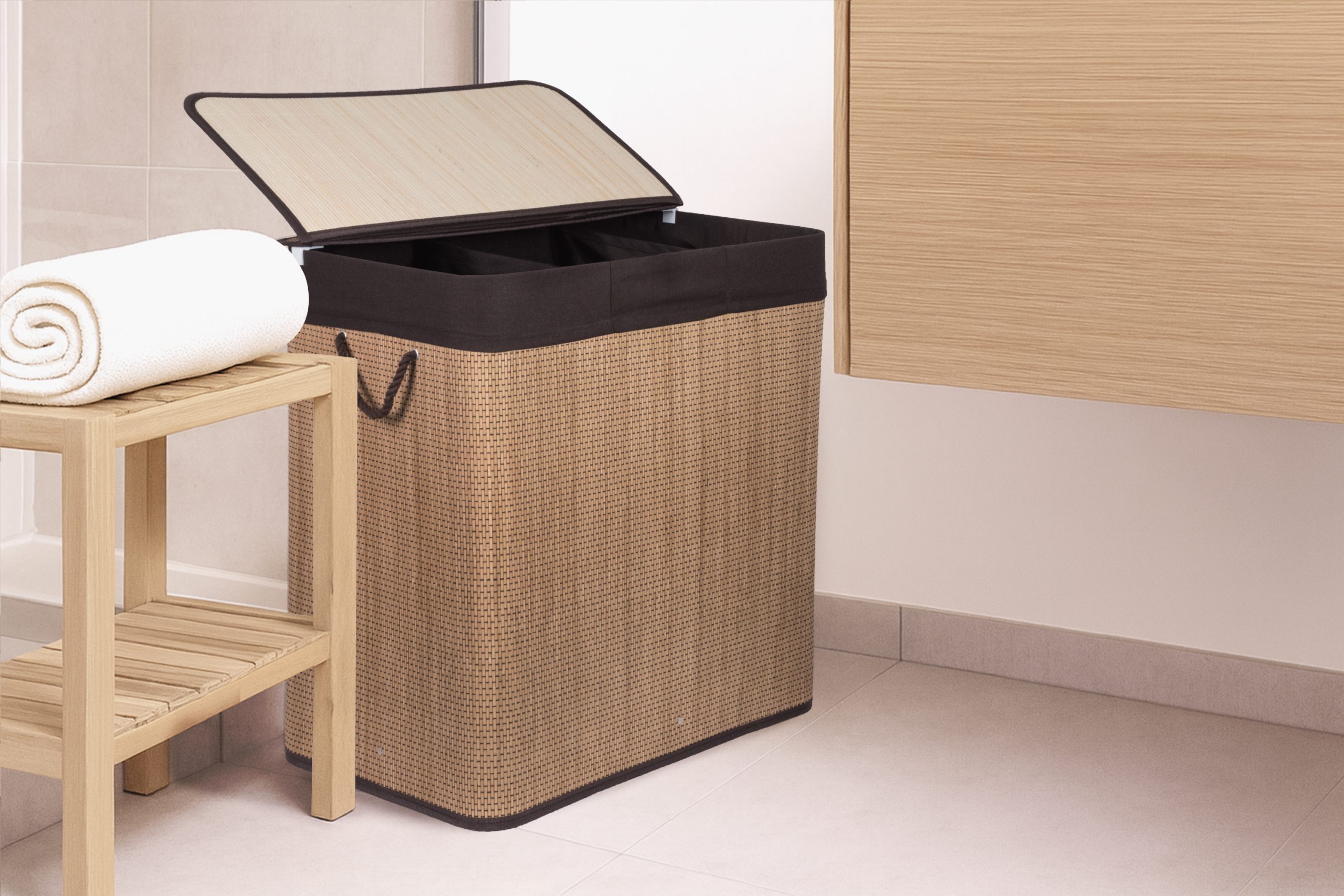 A G21 bambuszkosár , rögzített fedelű és mosható szövetbetéttel rendelkezik, három külön rekeszre osztva. Így mosás előtt szét válogathatja a piszkos ruhaneműt, és különálló darabokat helyezhet el anyagtól vagy színtől függően a kosárba .