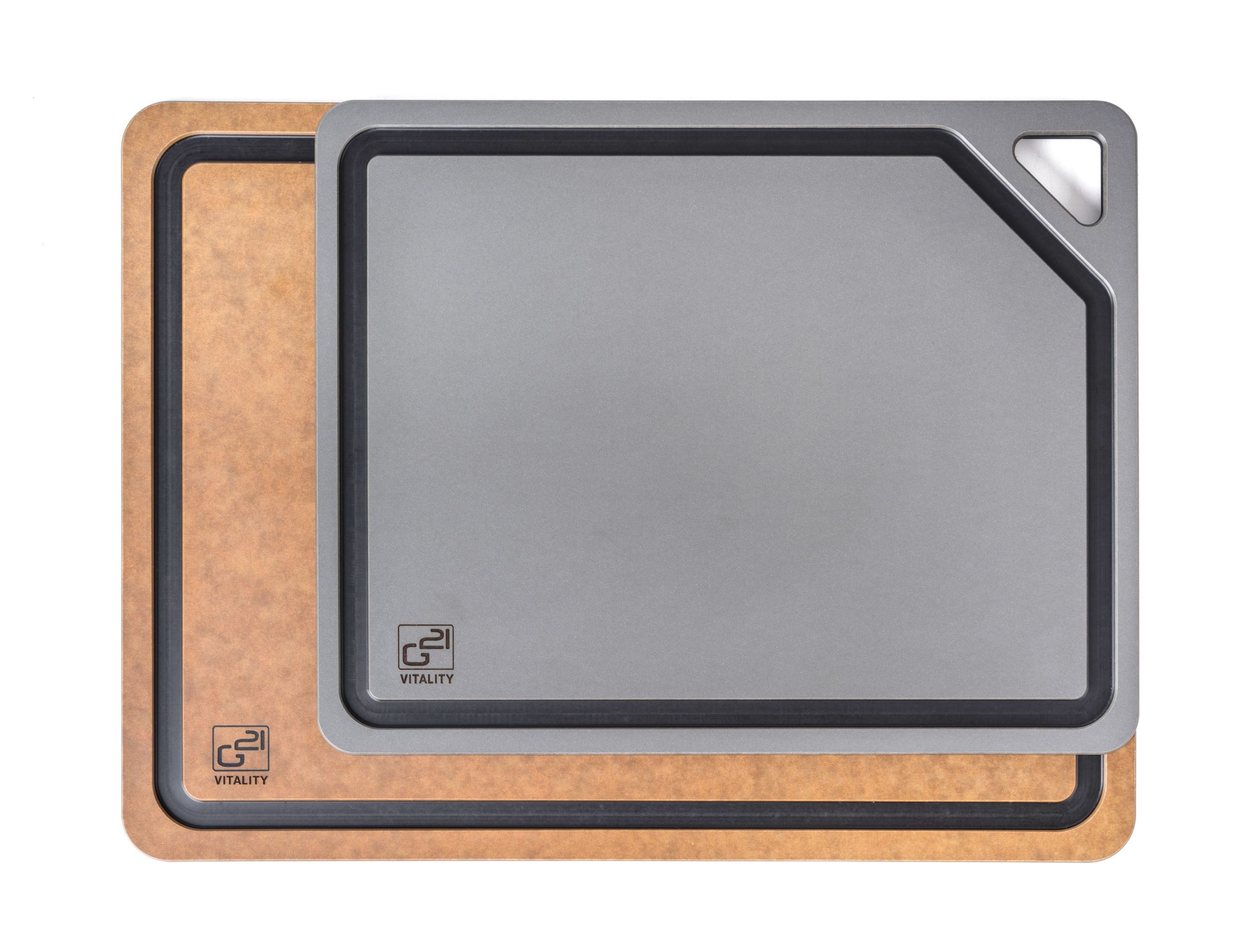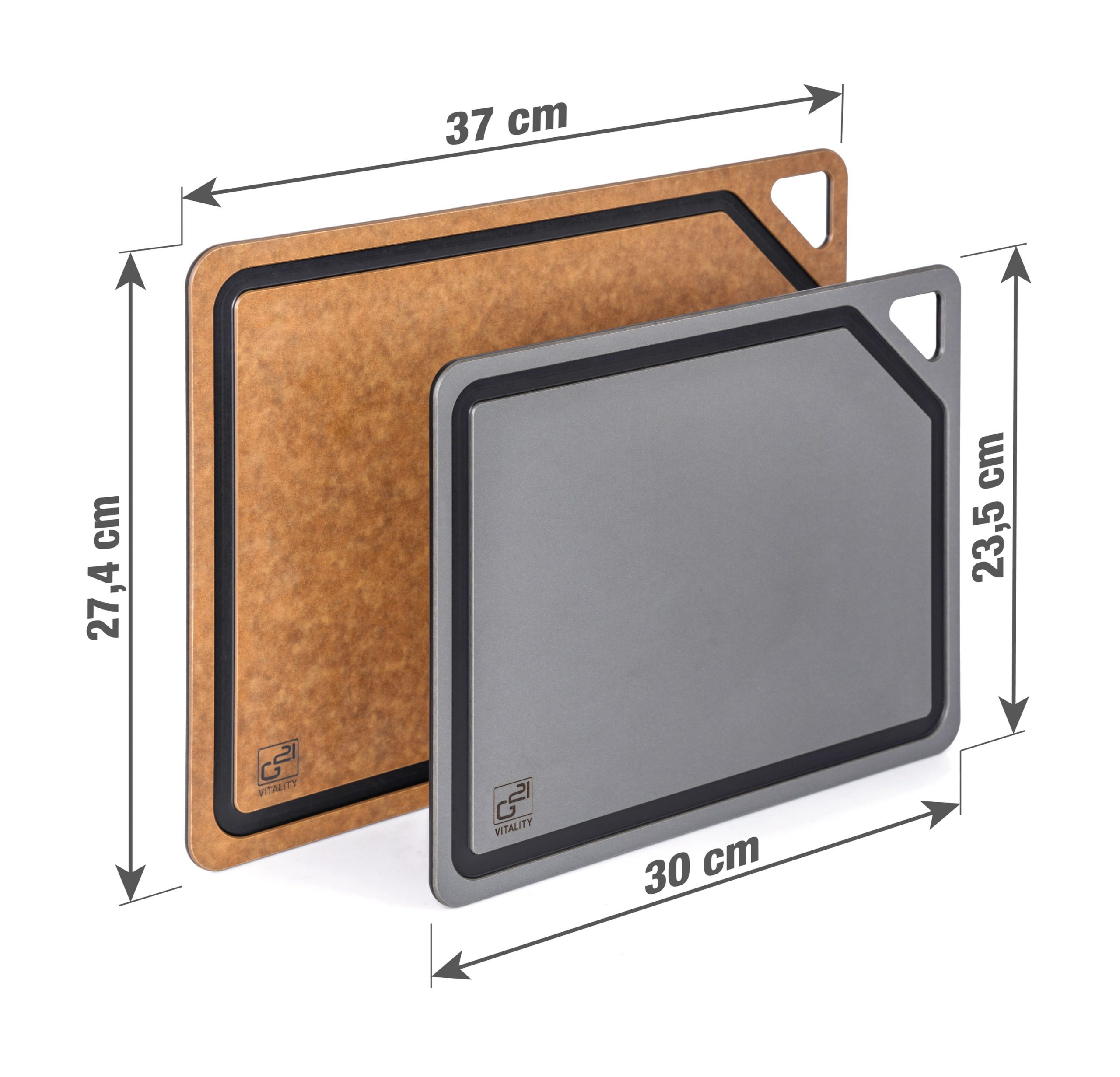Az biológiailag lebomló cellulózból készült univerzális EcoCut deszkák tartósságot, késekhez való kíméletet és modern megjelenést kínálnak. A hőállóságnak köszönhetően akár edényalátétként is használhatók forró edényekhez. A csúszásmentes felület biztosítja, hogy a deszka munka közben a helyén maradjon, míg a perem menti vájat felfogja a húslevet vagy más folyadékokat – így a konyhapult mindig tiszta marad. A csomag 2 méretű deszkát tartalmaz (30 × 23,5 cm és 37 × 27,4 cm), amelyek ideálisak hús, zöldség, gyümölcs és fűszernövény előkészítéséhez.