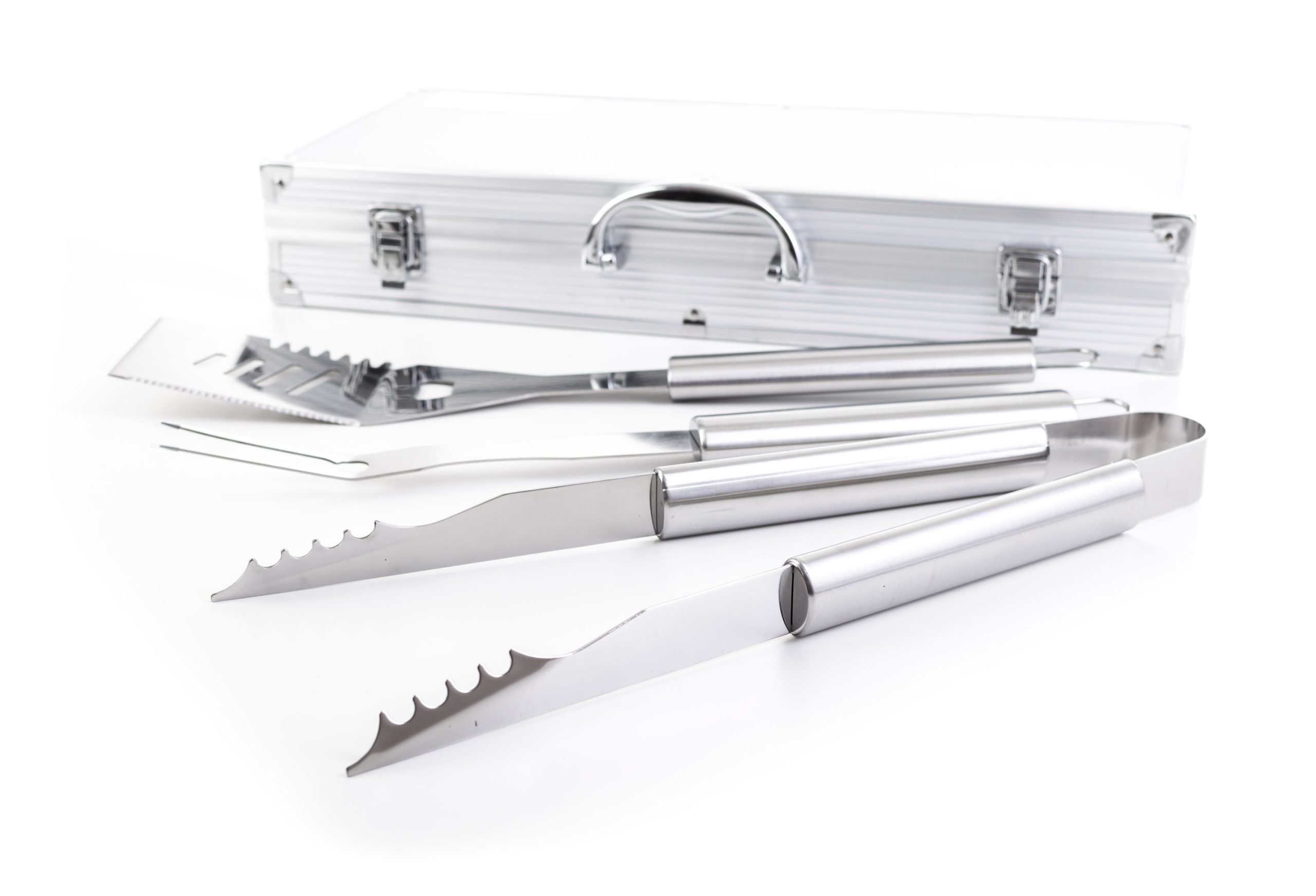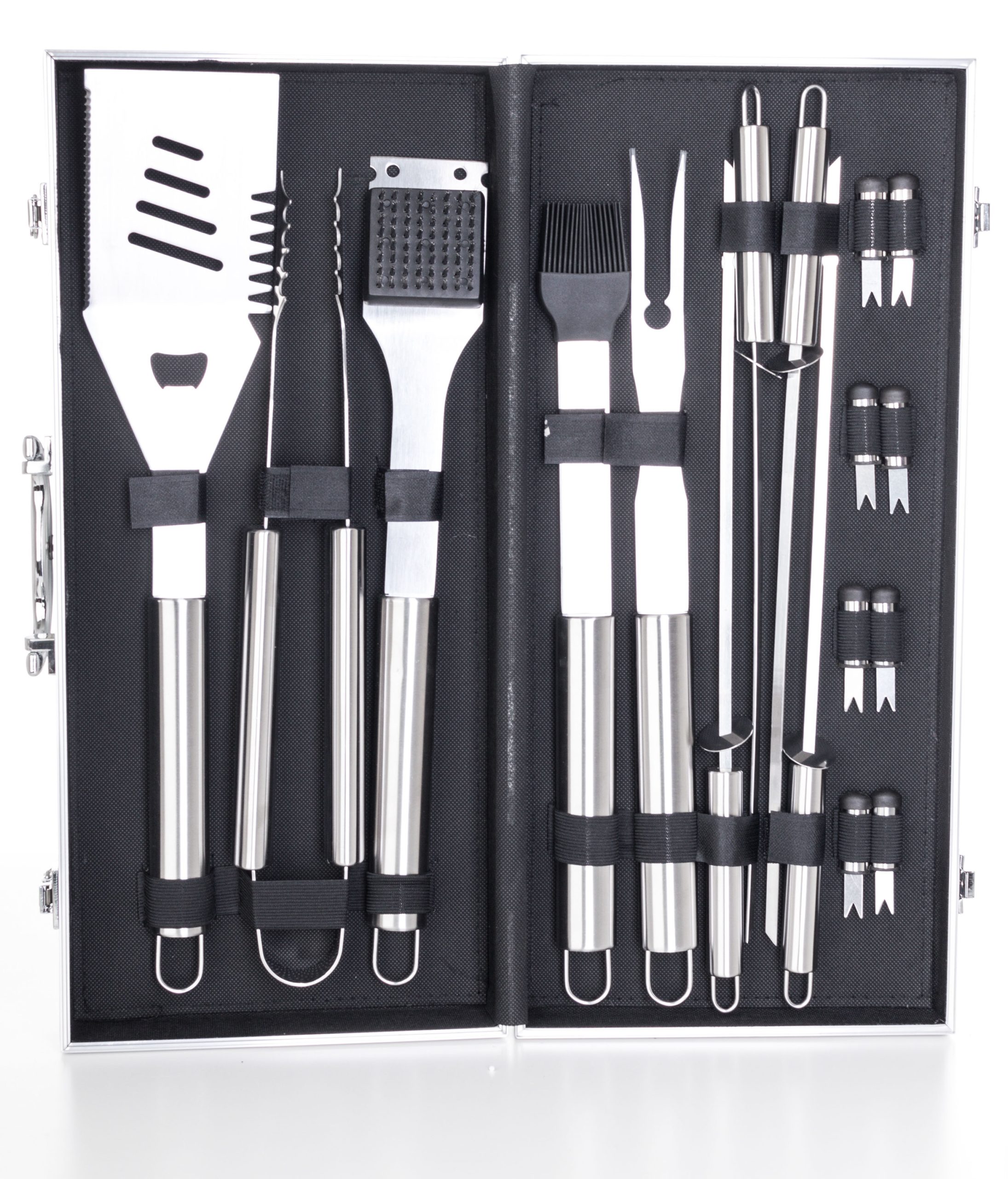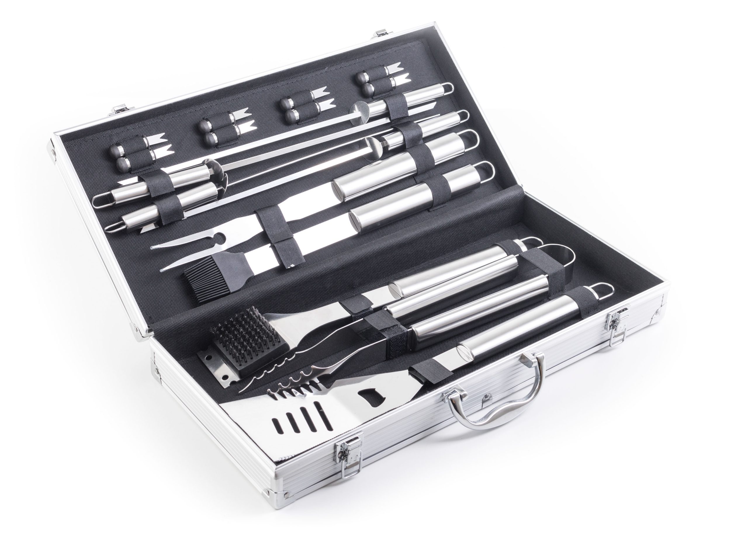 A készlet tartalmaz minden eszközt a gond nélküli grillezéshez. A készlet része egy húsforgató, villa, csipesz, kenőecset, tisztító kefe, pálcikák kukoricára és nyárstűk. Az eszközök 40 cm-es hossza biztosítja, hogy grillezés közben a lángok nem égetik Önt meg és nem fog Önre fröcsögni az olaj. Az egyszerű áthelyezés és tárolás érdekében az eszközök egy praktikus alumínium bőröndbe van elhelyezve.