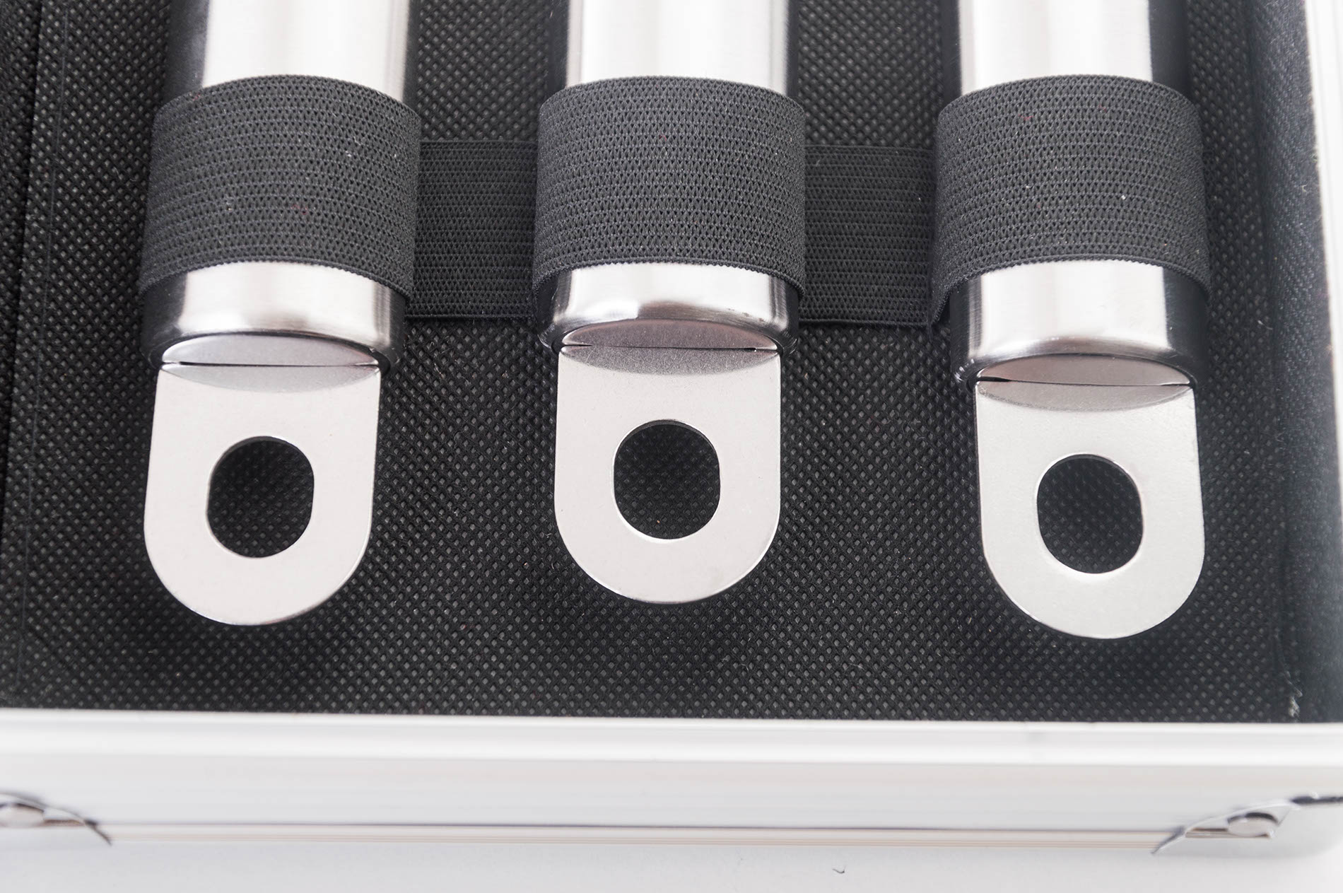 A készlet tartalmaz minden eszközt a gond nélküli grillezéshez. A készlet része egy húsforgató, villa, csipesz, hosszú grillező kés és kenőecset. Az eszközök 40 cm-es hossza biztosítja, hogy grillezés közben a lángok nem égetik Önt meg és nem fog Önre fröcsögni az olaj. Az egyszerű áthelyezés és tárolás érdekében az eszközök egy praktikus alumínium bőröndbe van elhelyezve.