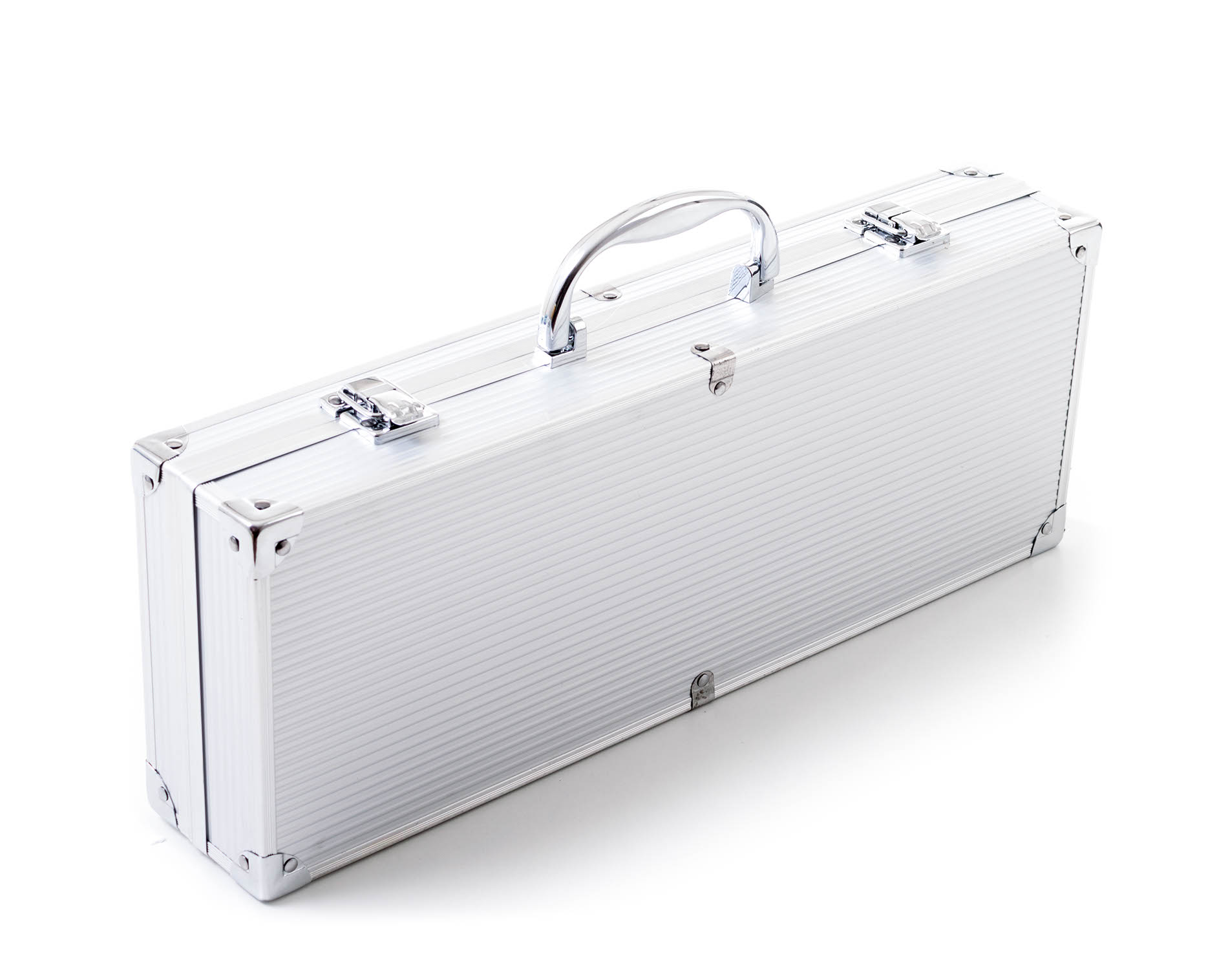 A bőröndben lévő G21 grillező eszköz húsforgatót, villát, grillező csipeszt, hosszú grillező kést és kenőecsetet tartalmaz. Az ellenálló alumínium bőrönd a 40 cm hosszú grillező eszközök egyszerű és biztonságos áthelyezését és tárolását biztosítja.